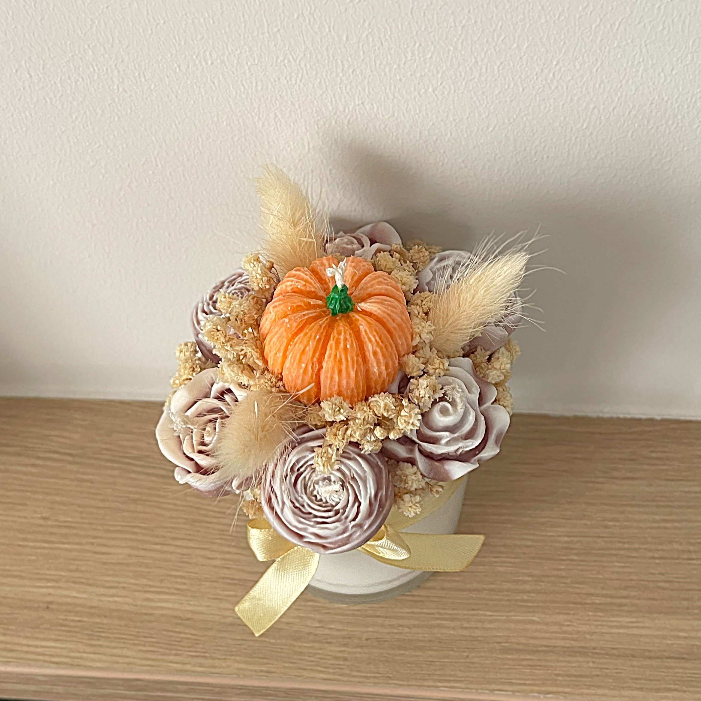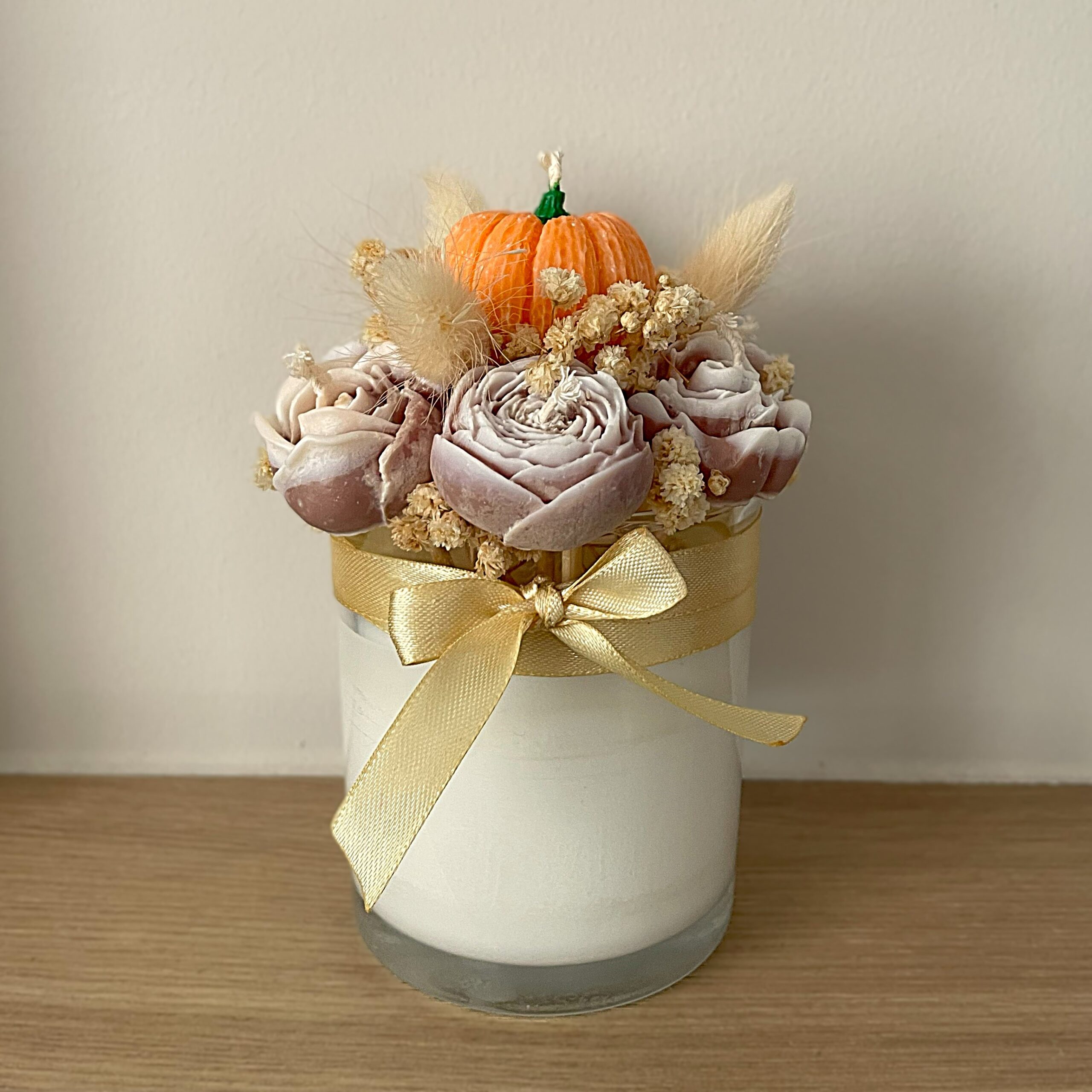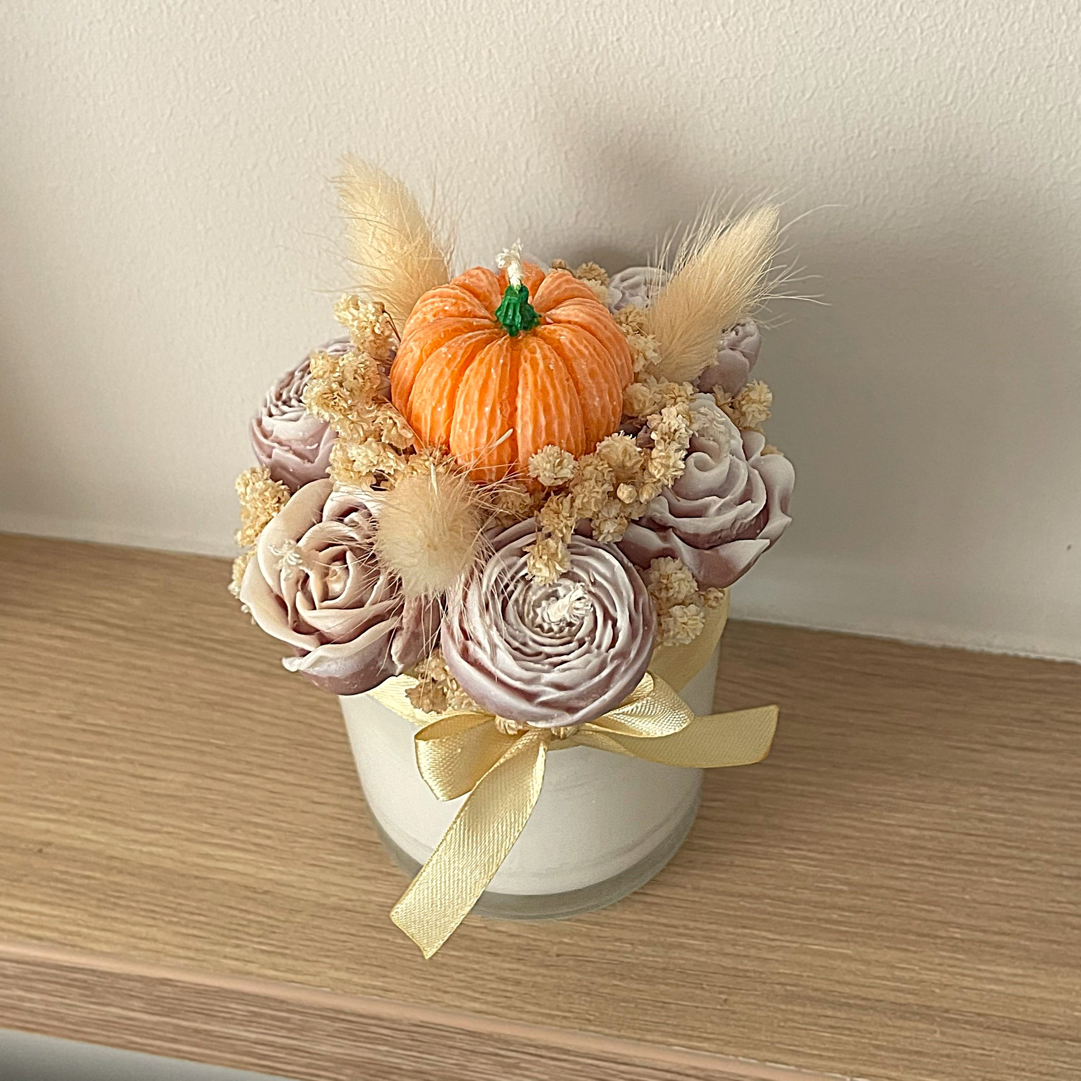 To zapachowa świeca w szkle, sześć uroczych kwiatów i mini dynia. Całość zdobią trwałe, stabilizowane rośliny, które nie tracą uroku.