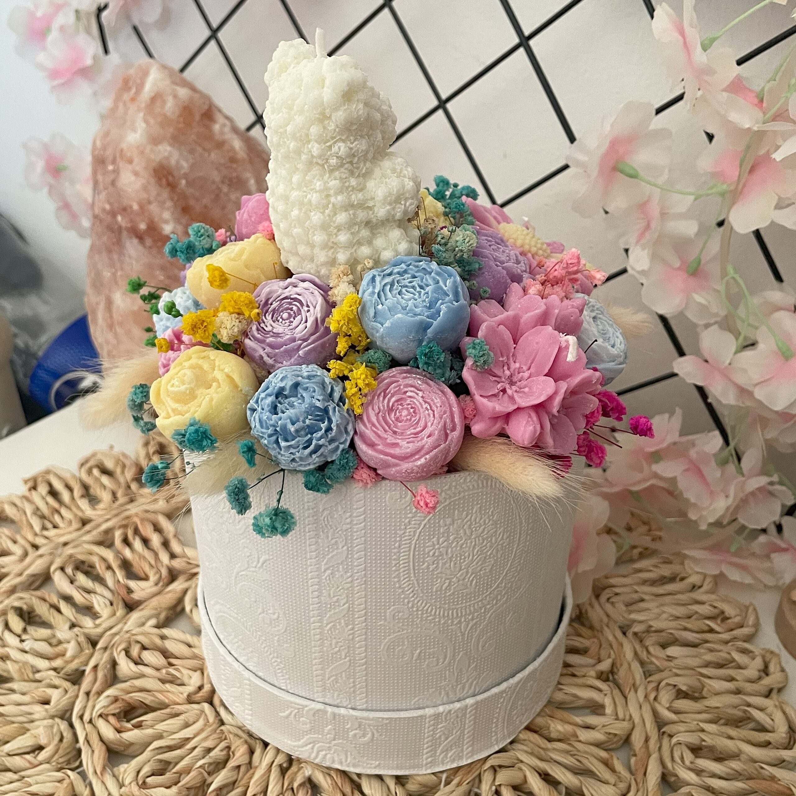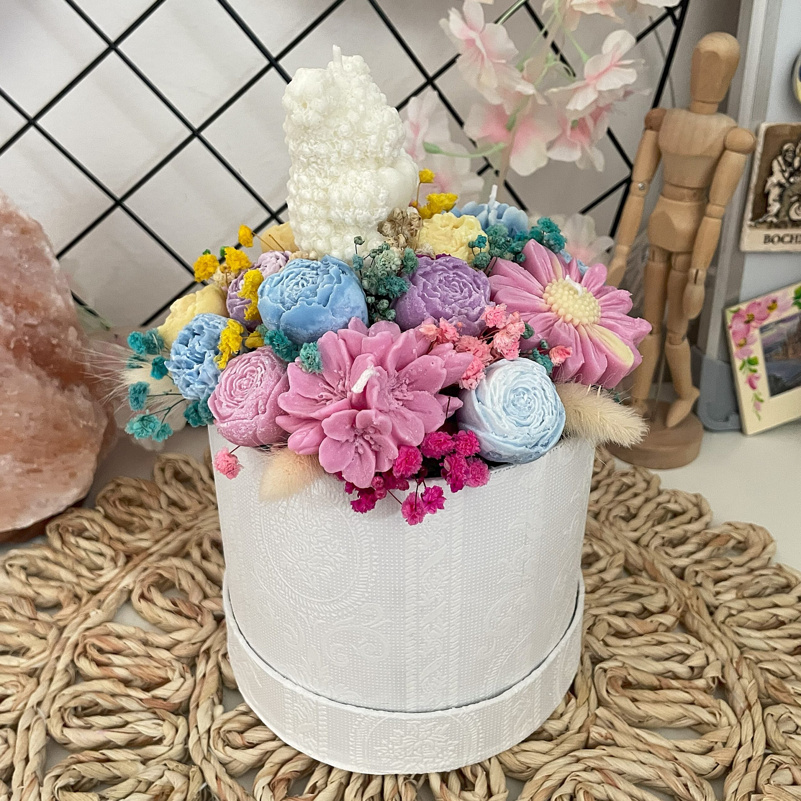 🌸 Biały box – elegancki, z kobiecym wzorem, wypełniony kolorową, stabilizowaną gipsówką