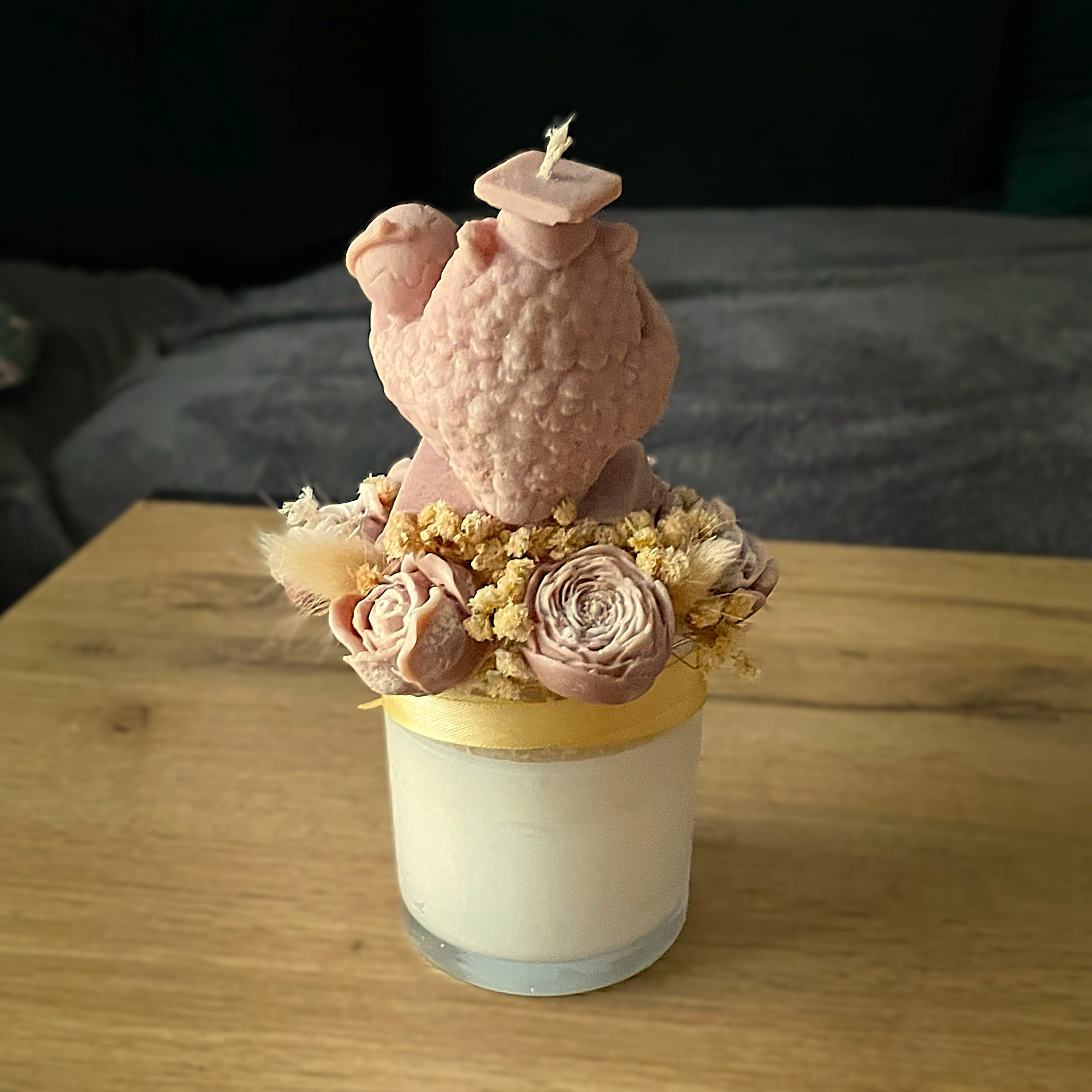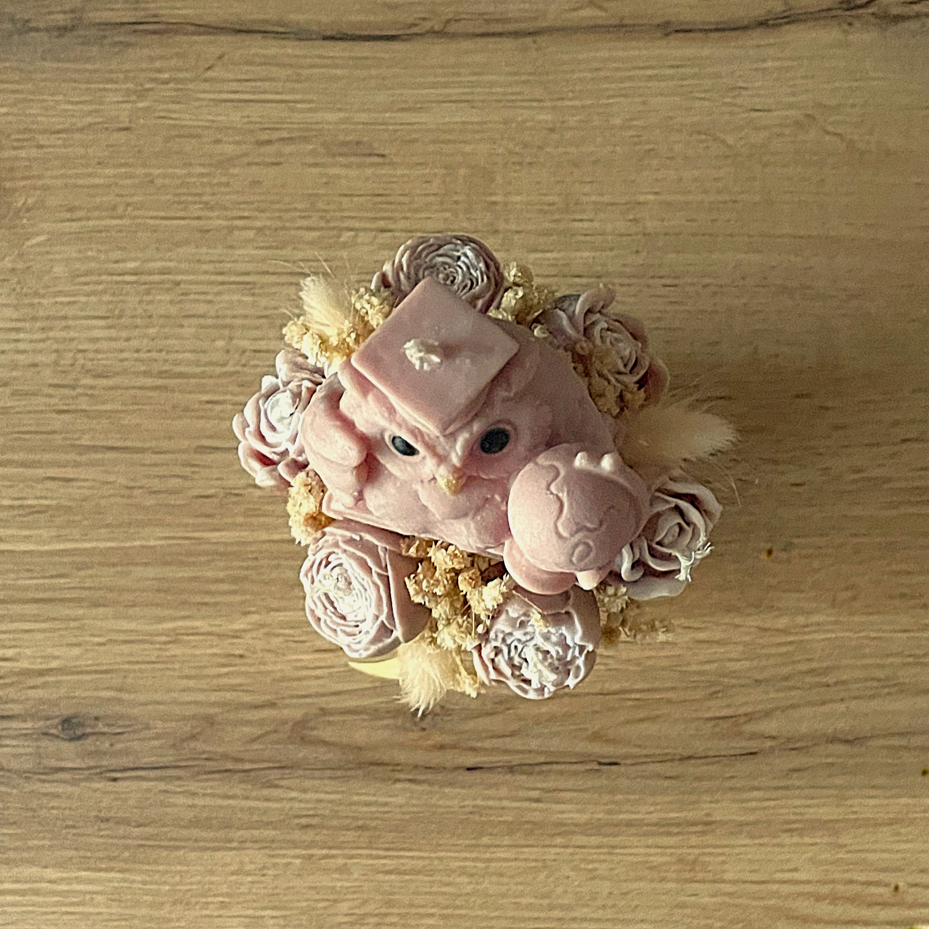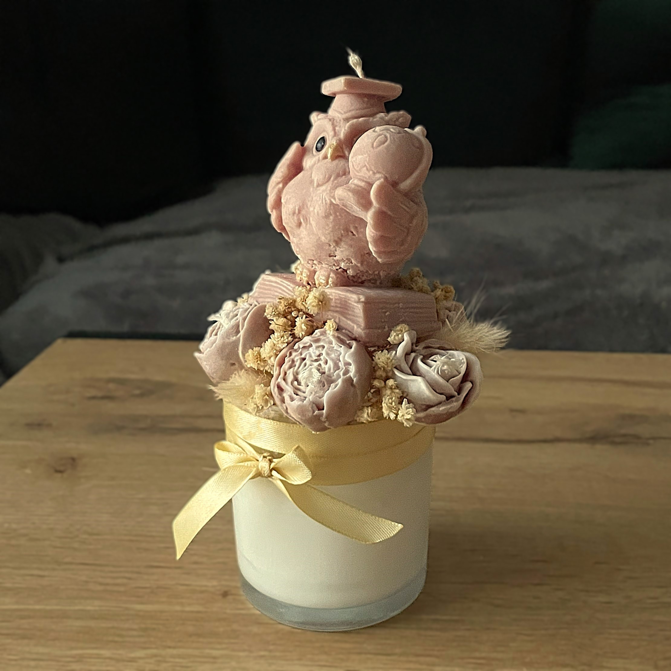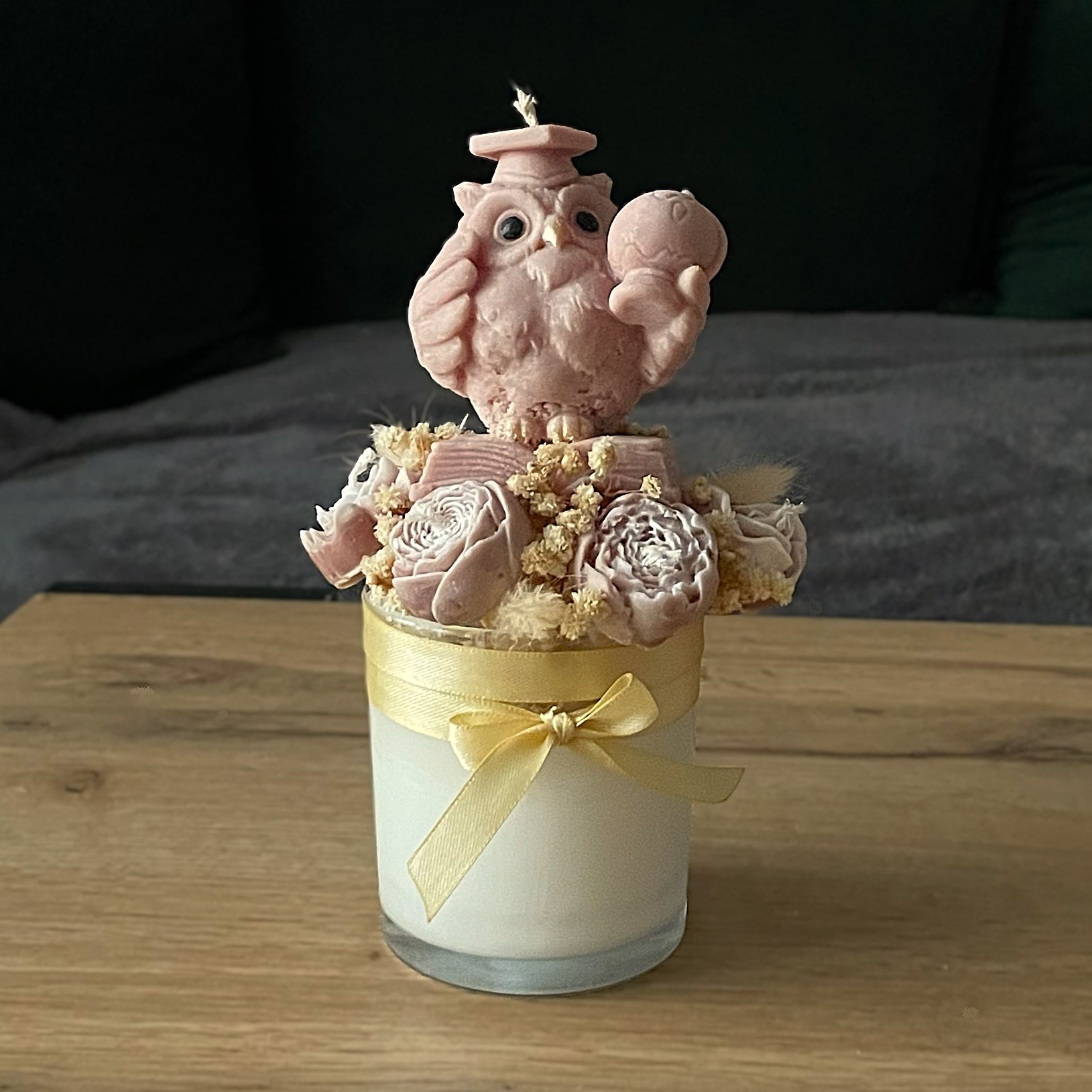 W bukiecie znajdziesz kwiaty wykonane z naturalnej soi, które nigdy nie więdną, oraz świecę w kształcie sowy, ponieważ symbolizuje mądrość i naukę.
