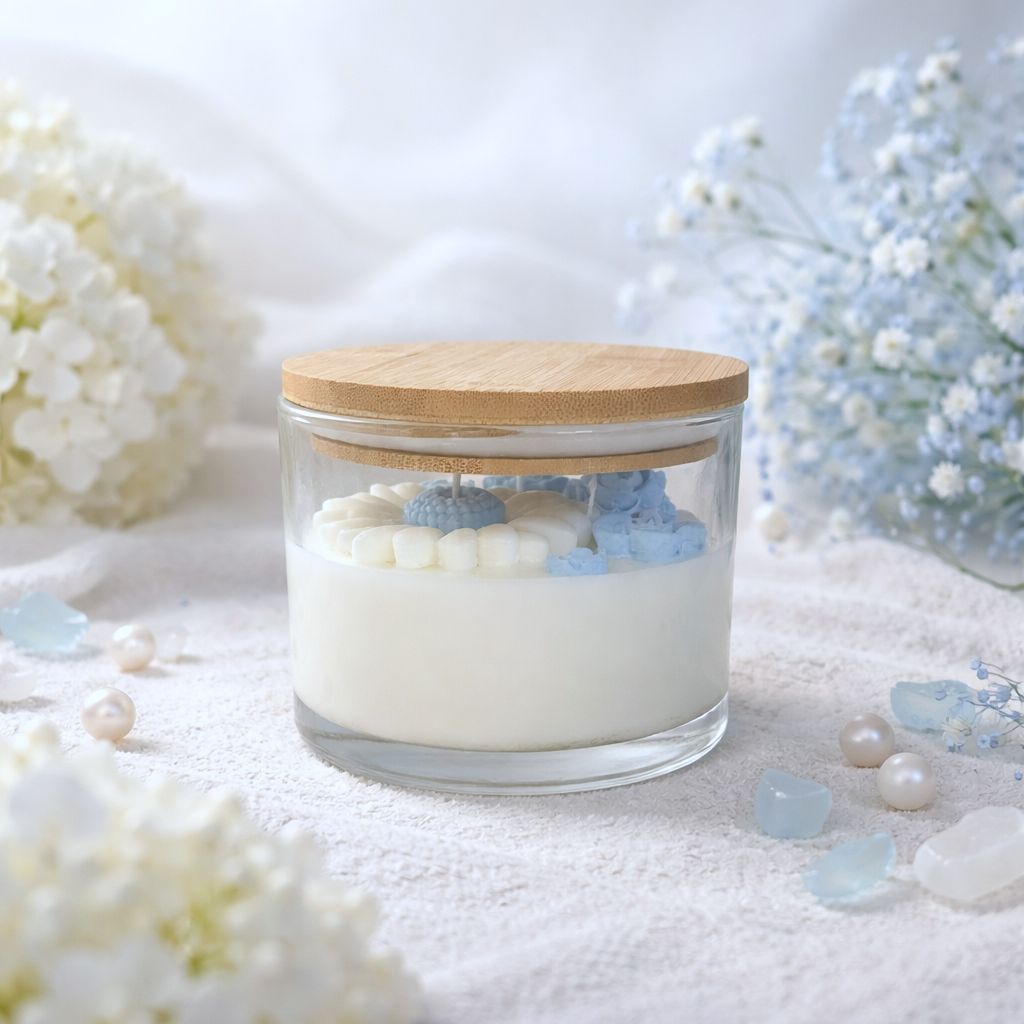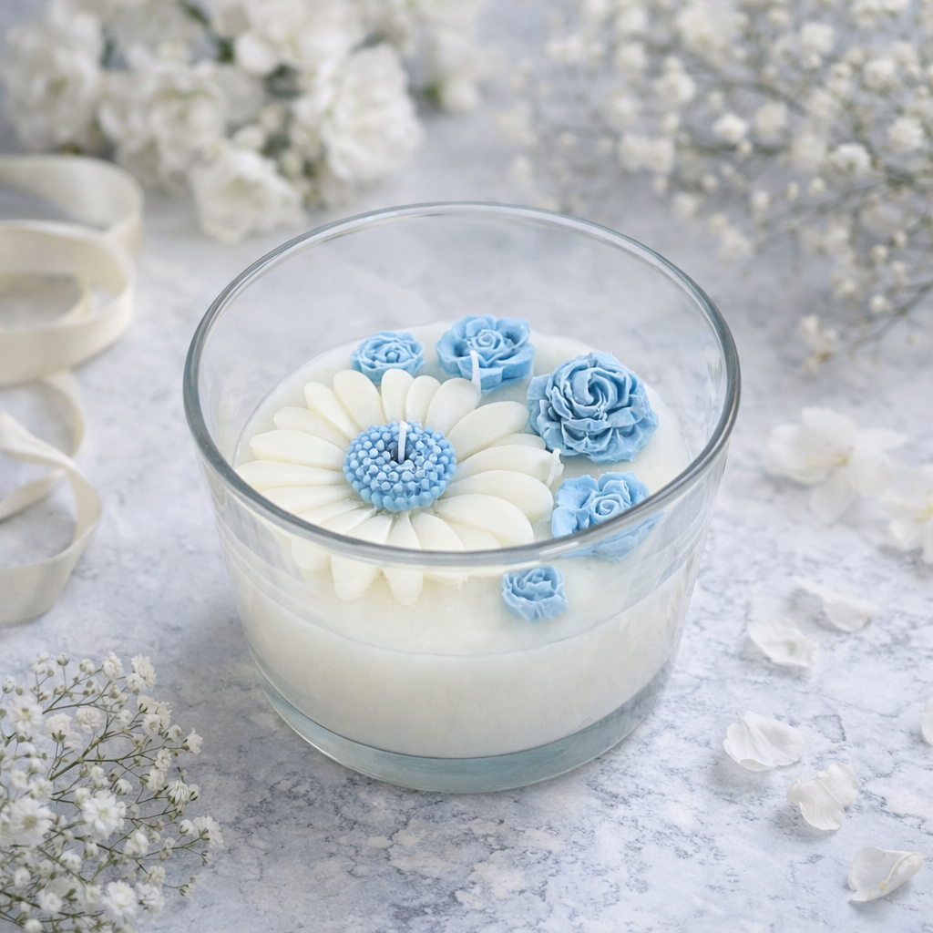 🌸 Delikatna świeca motywem kwiatów– ręcznie robiona z wosku sojowego