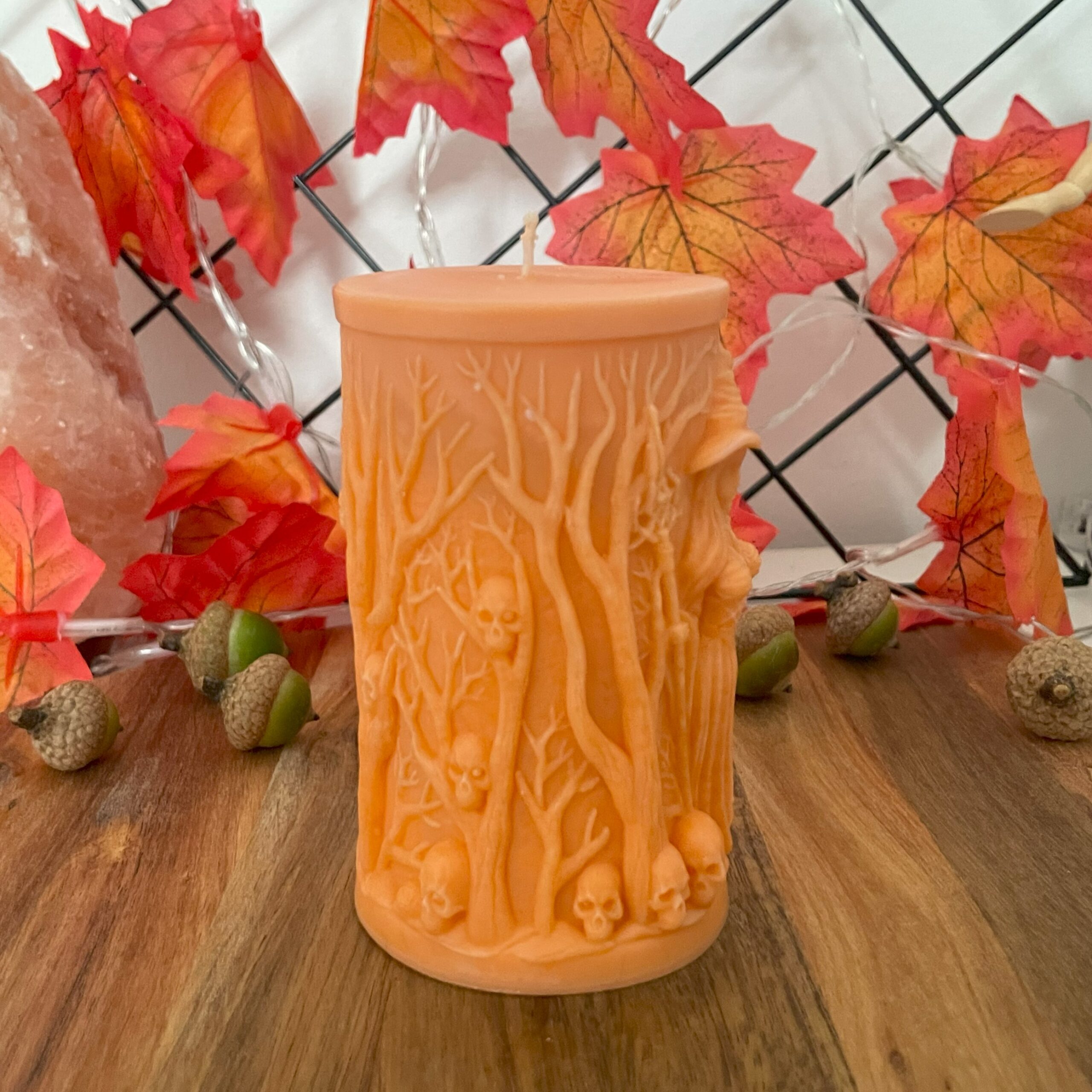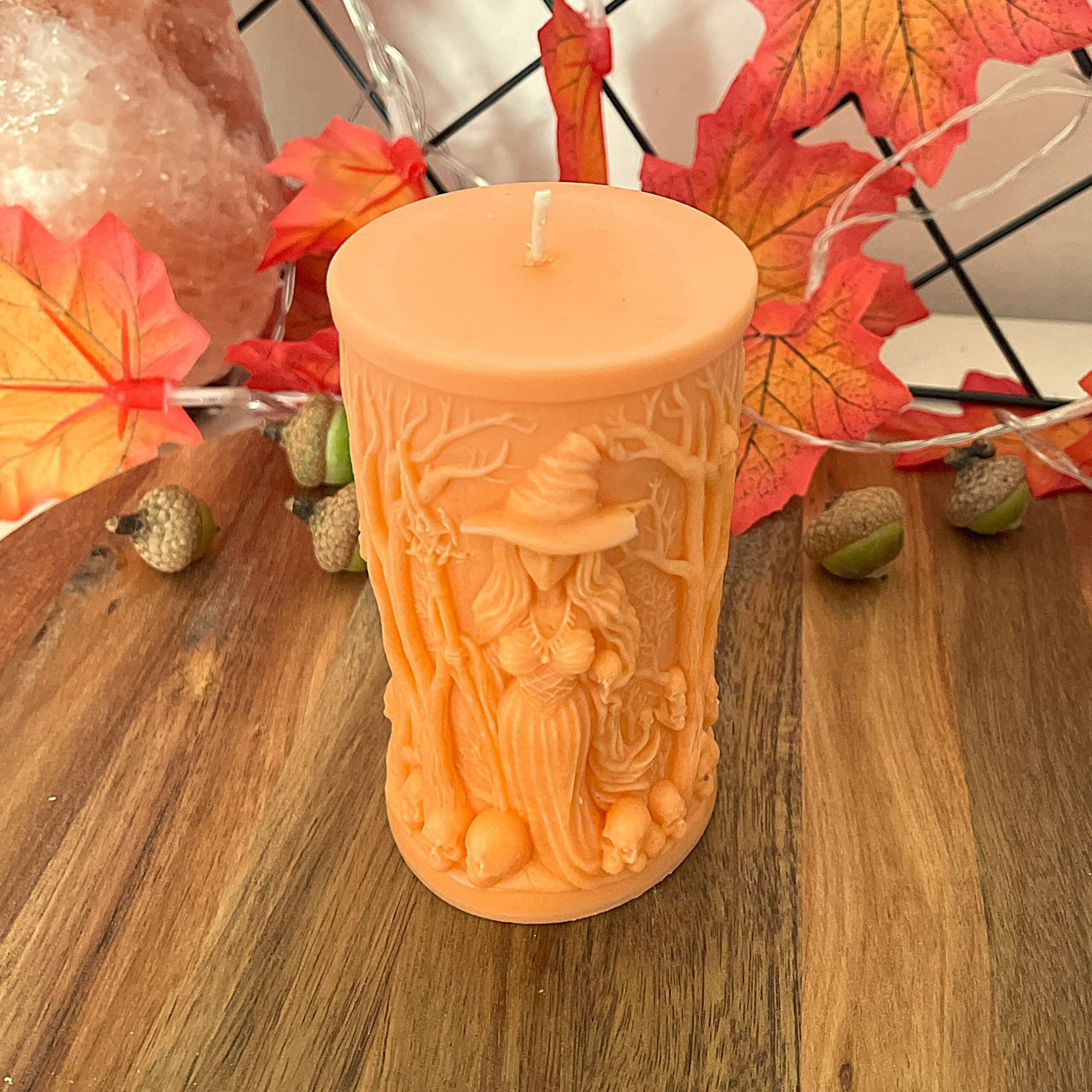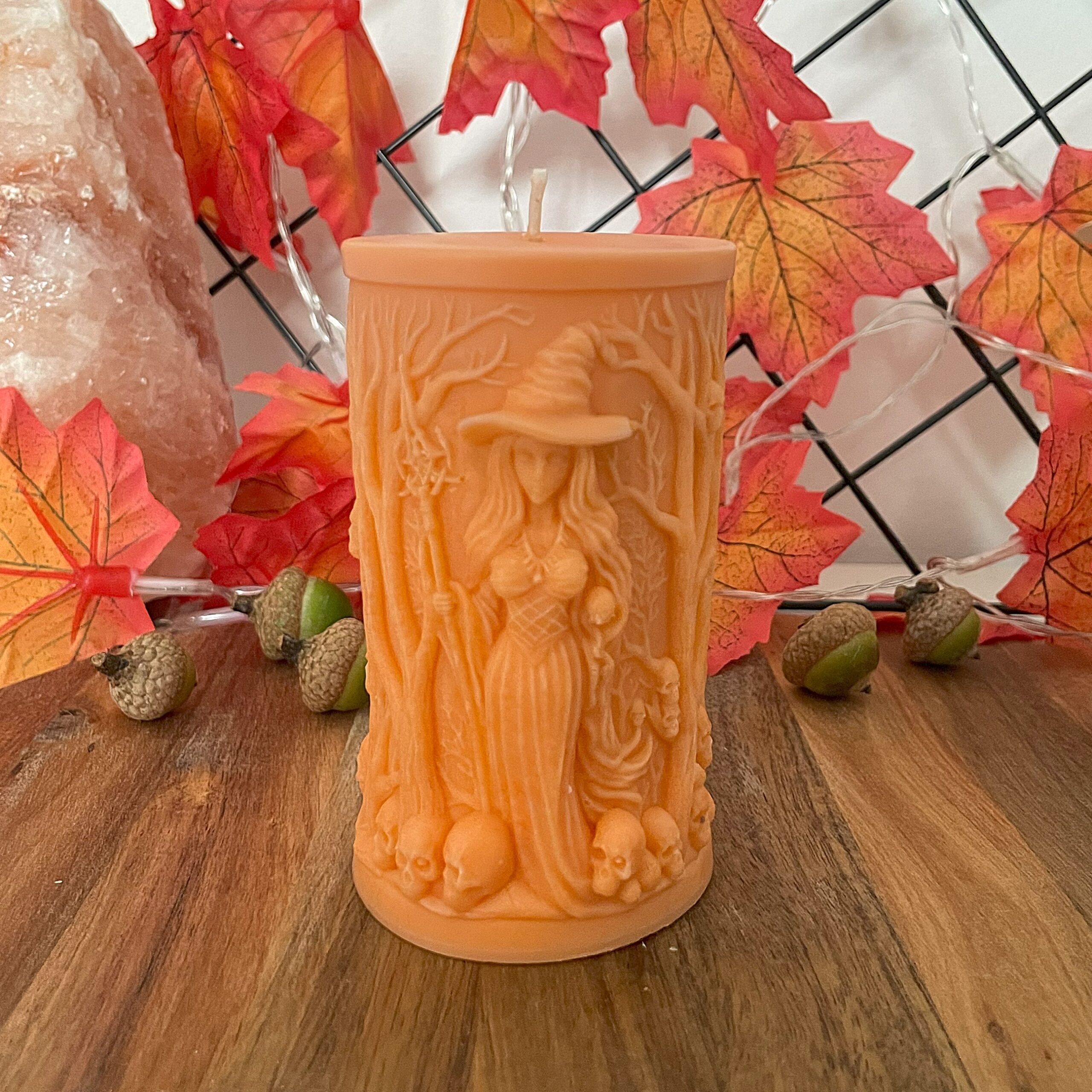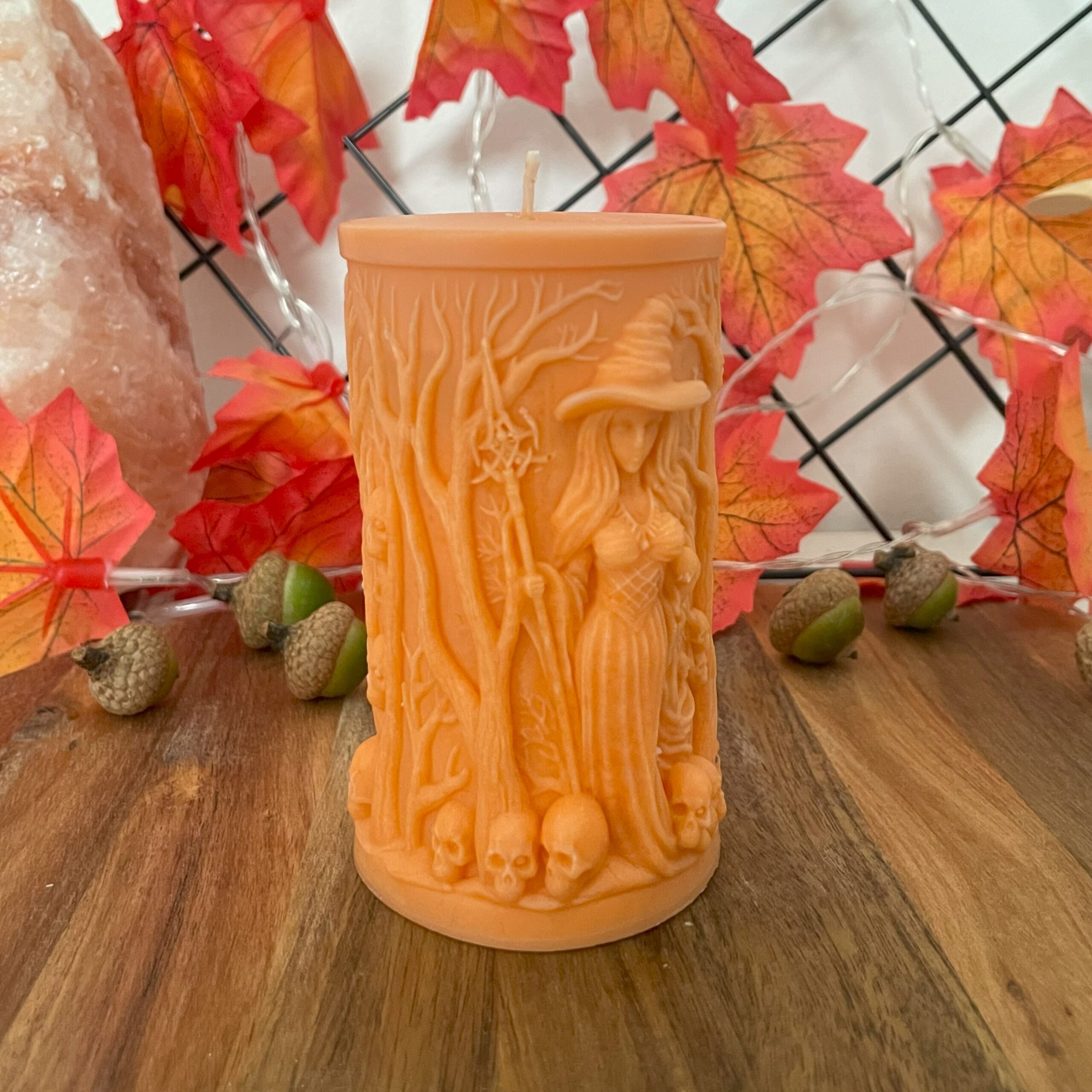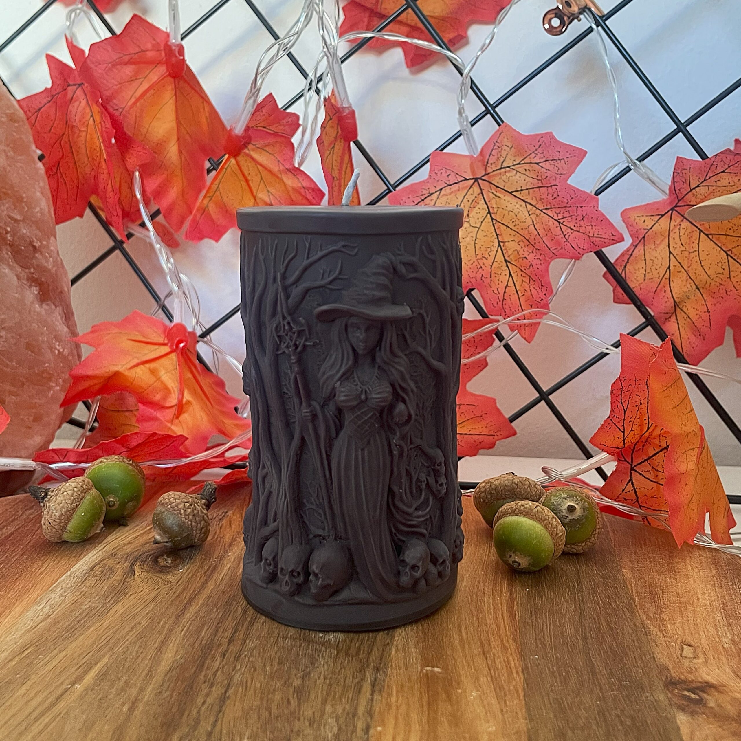 Świeca wolnostojąca – Halloweenowa – z motywem czarownicy, lasu i czaszek, z dopracowanymi detalami.