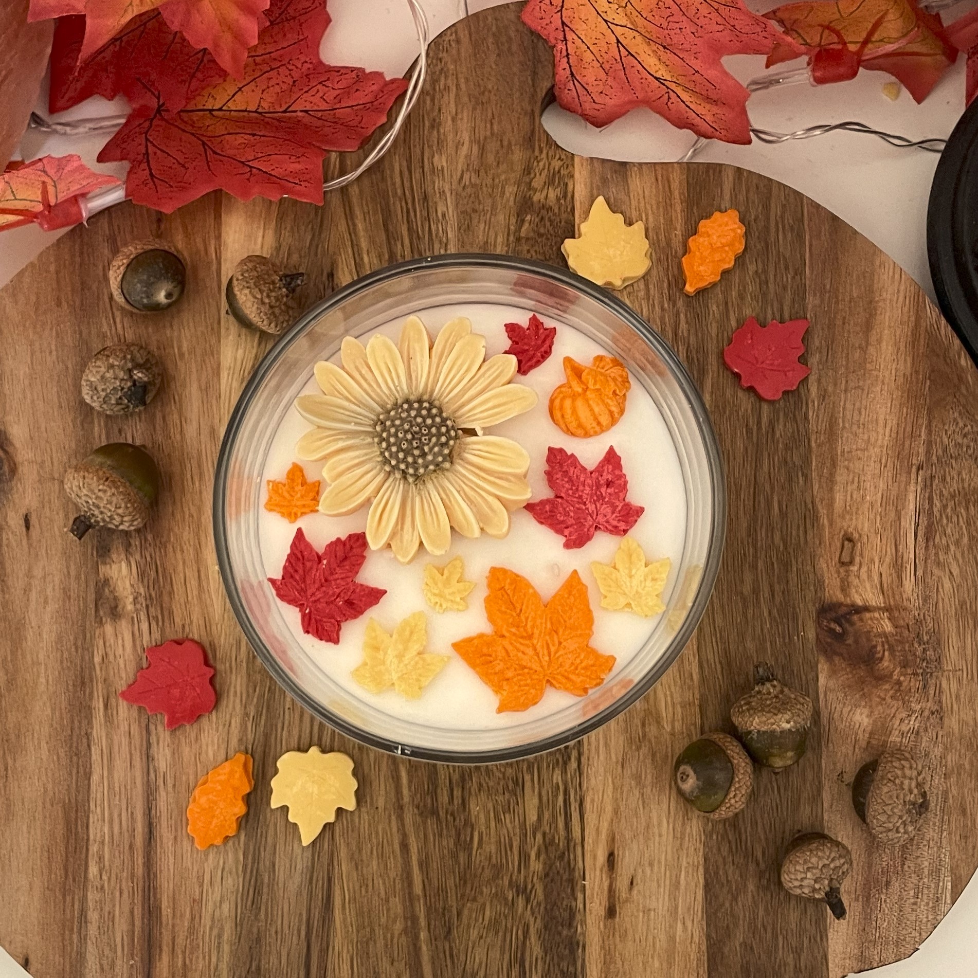 Świeca w szklanym słoiczku z bambusową pokrywką – jesienny motyw z dużym żółtym kwiatem i kolorowymi liśćmi.