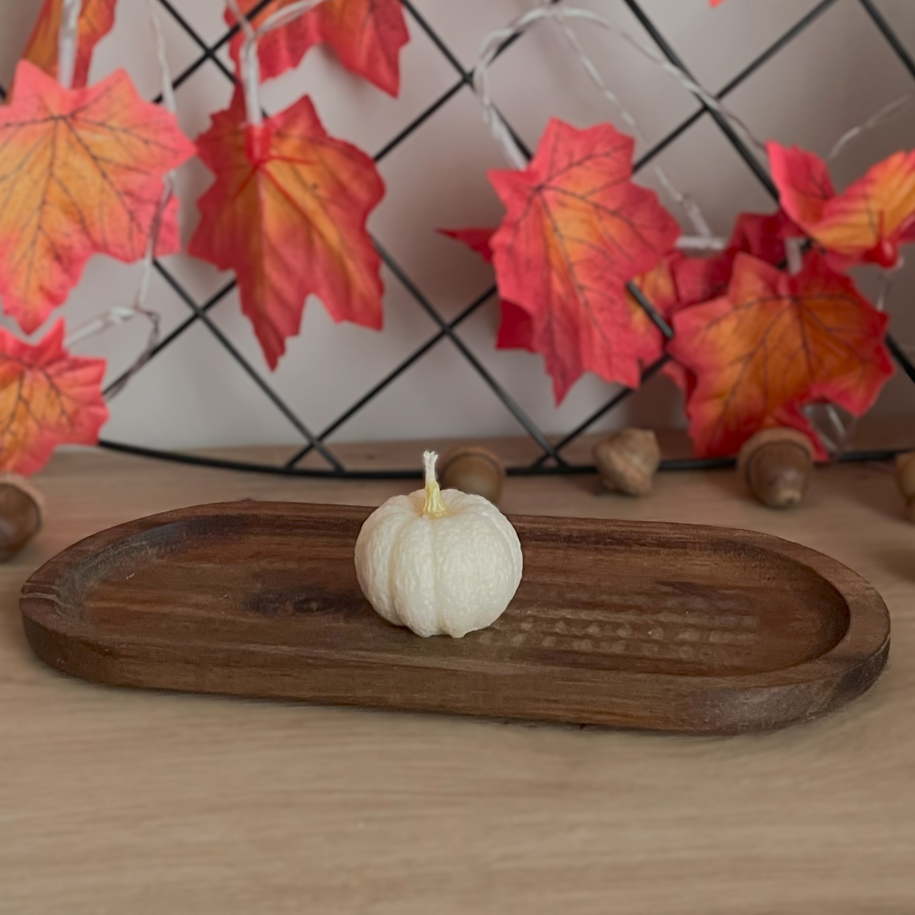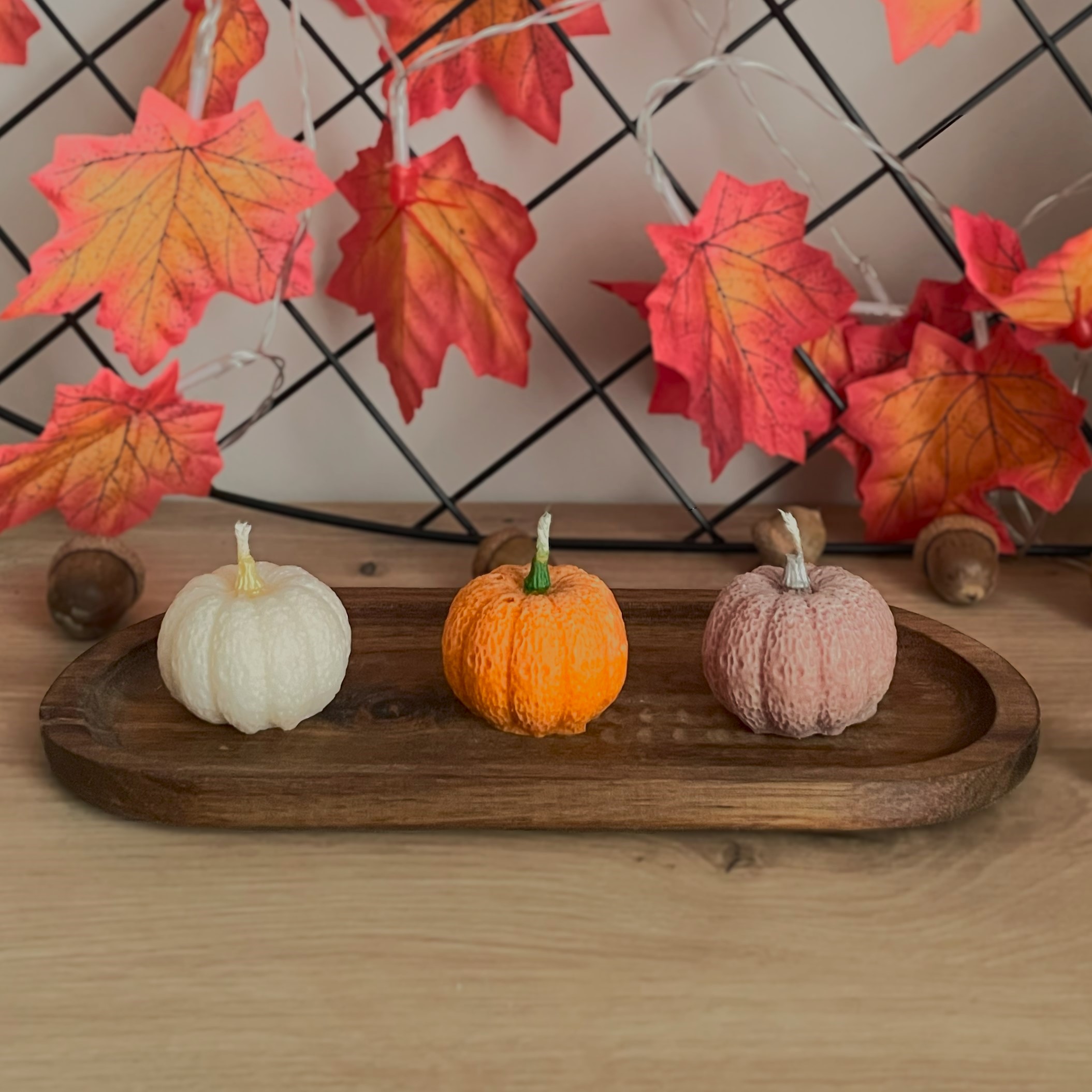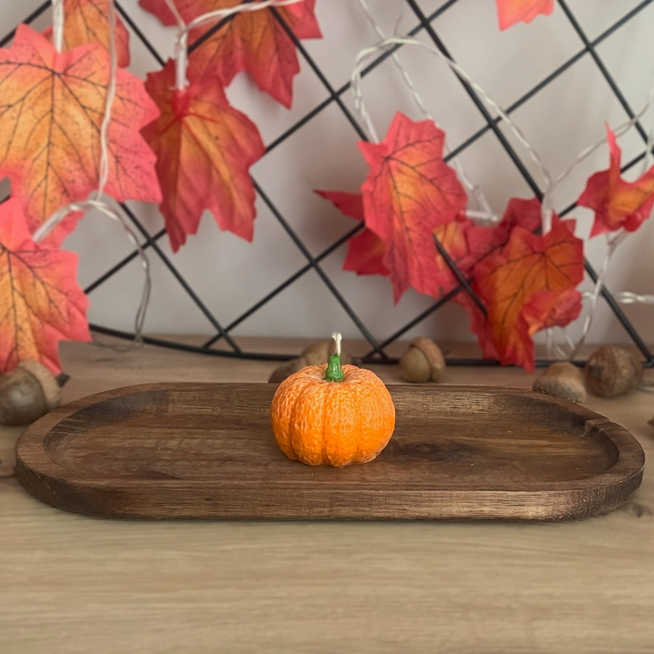 Ręcznie robiona, urocza świeca w kształcie dyni – wysokość ok. 4 cm, średnica ok. 3,6 cm, waga ok. 30 g.