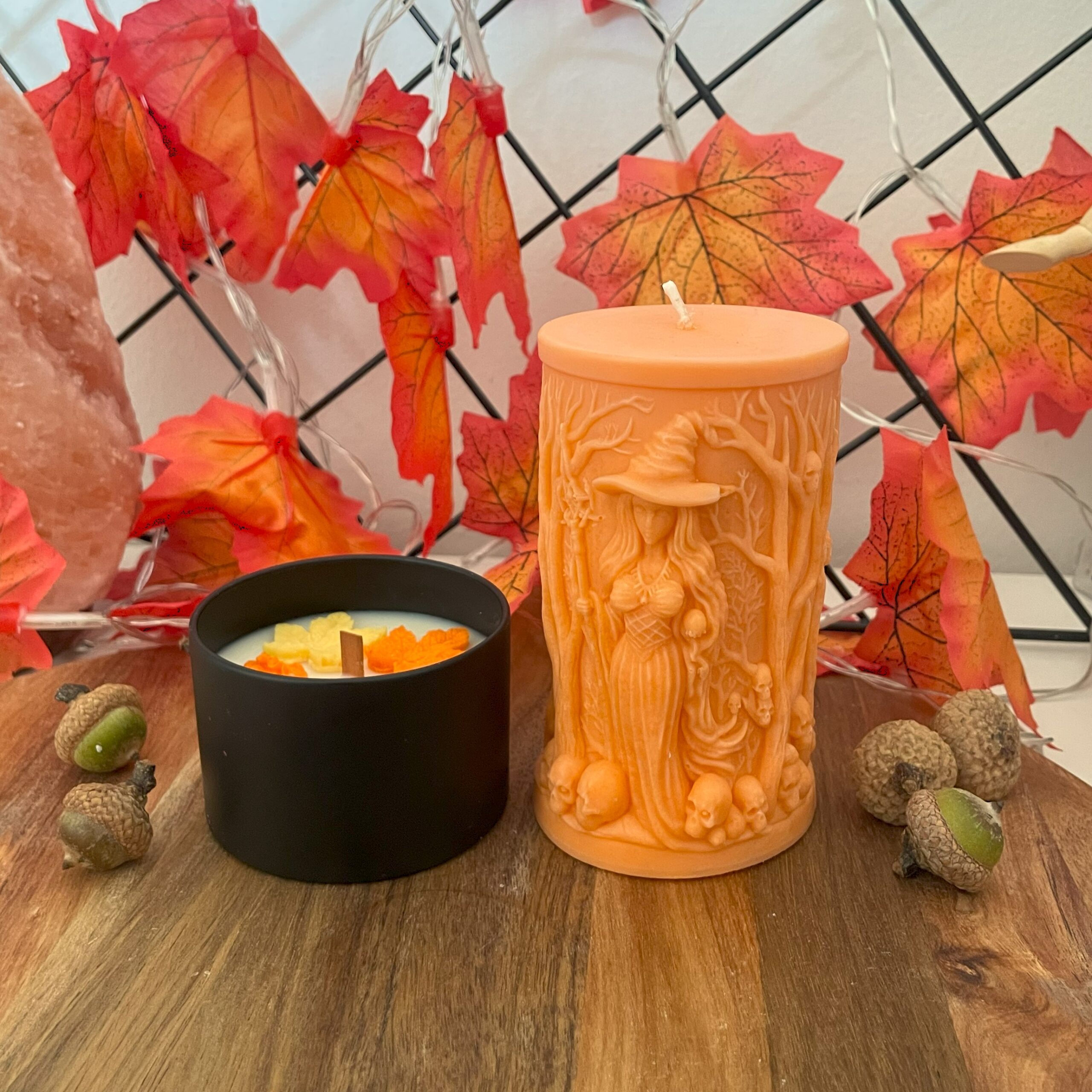 Wprowadź do swojego wnętrza atmosferę złotej jesieni i halloweenowej magii dzięki zestawowi dwóch unikalnych świec: