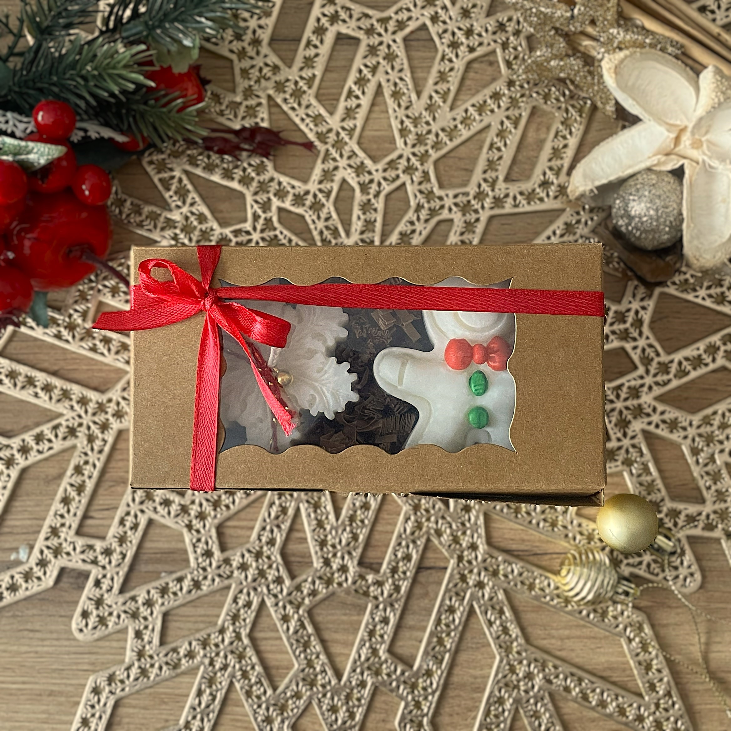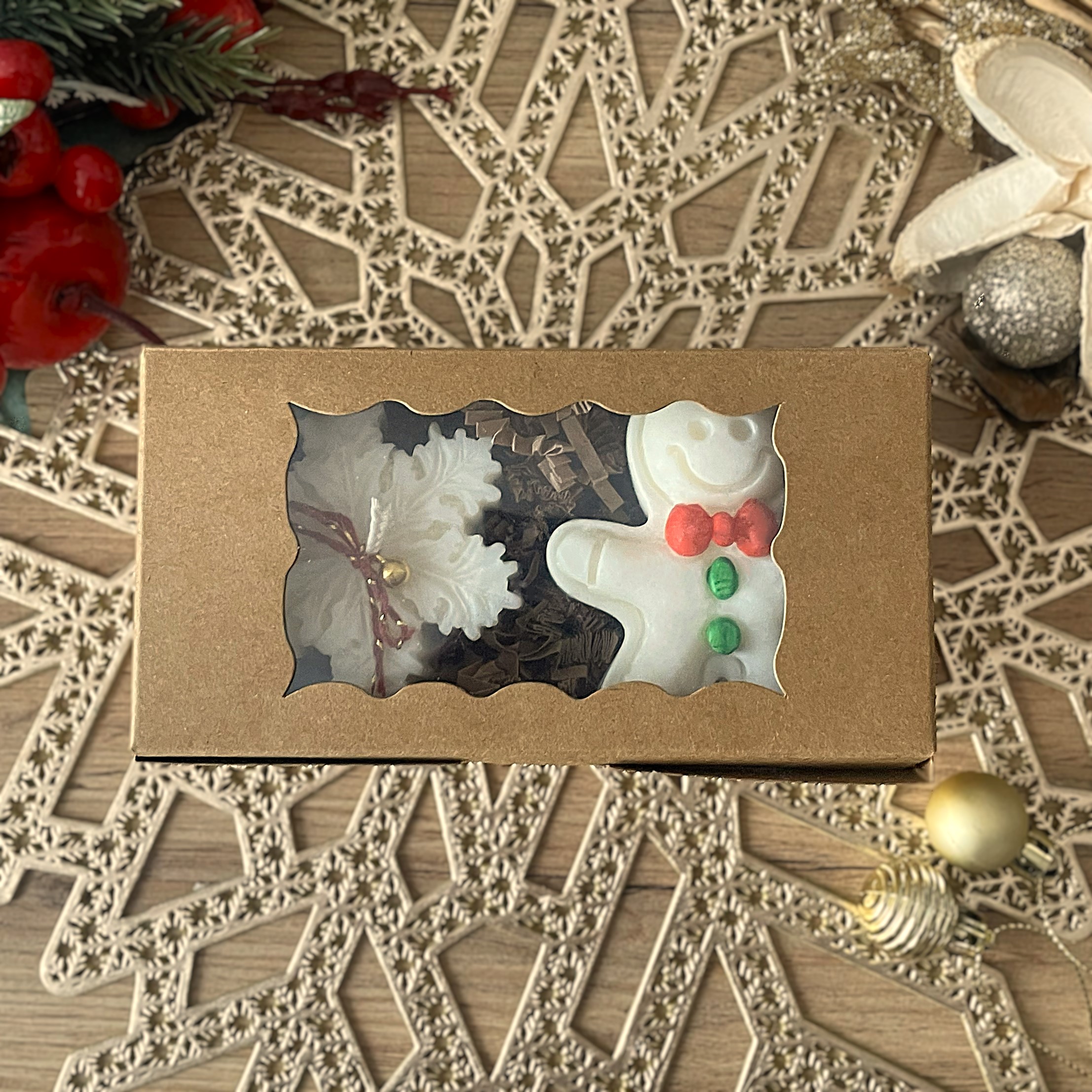 Świecę sojową w kształcie płatka śniegu – delikatny i elegancki element zimowej dekoracji, który pięknie komponuje się z piernikowym ludkiem.