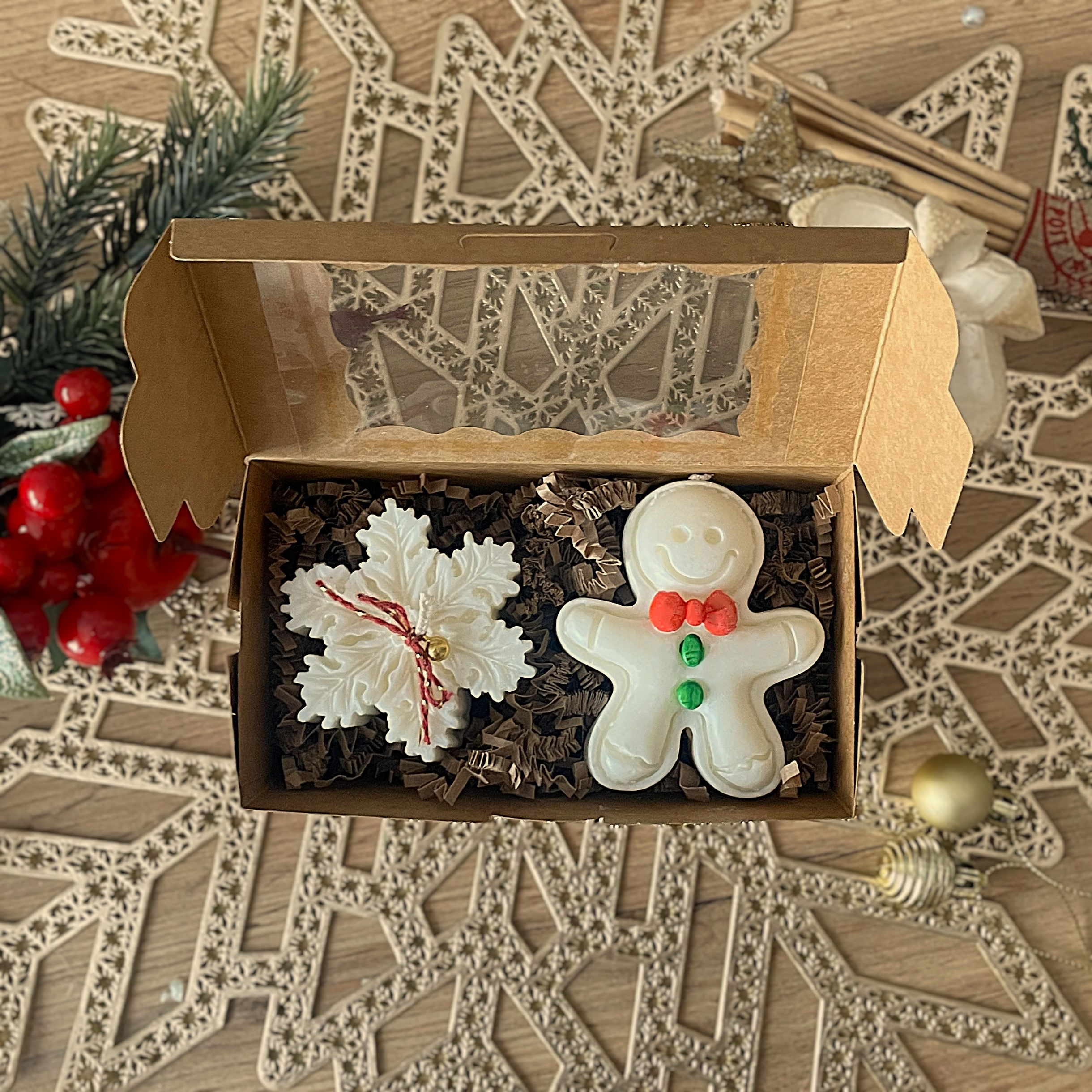 Zestaw 2 świec sojowych – Piernikowy Ludek i Śnieżynka 🎁