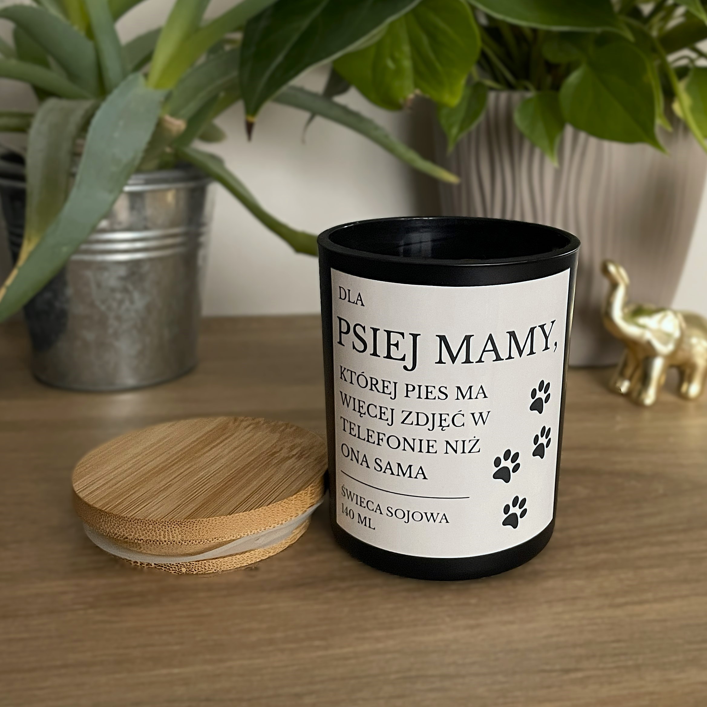 Świeca sojowa „Dla psiej mamy, której pies ma więcej zdjęć w telefonie niż ona sama” – idealny prezent dla miłośniczek psów, psich mam i behawiorystów.