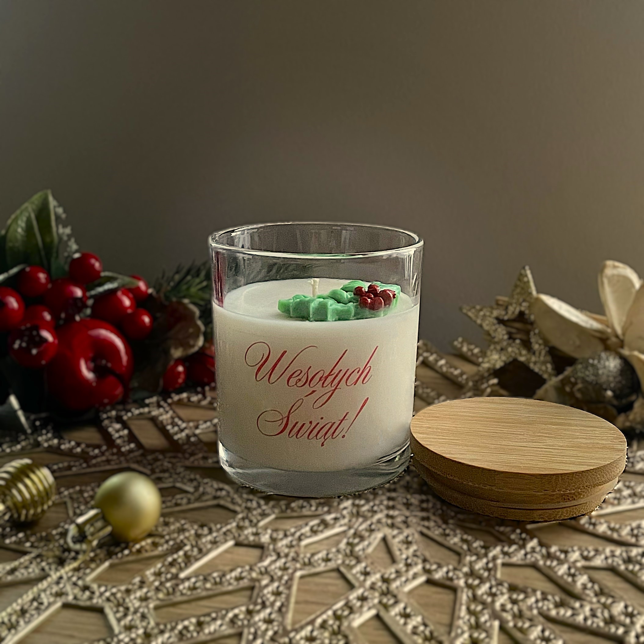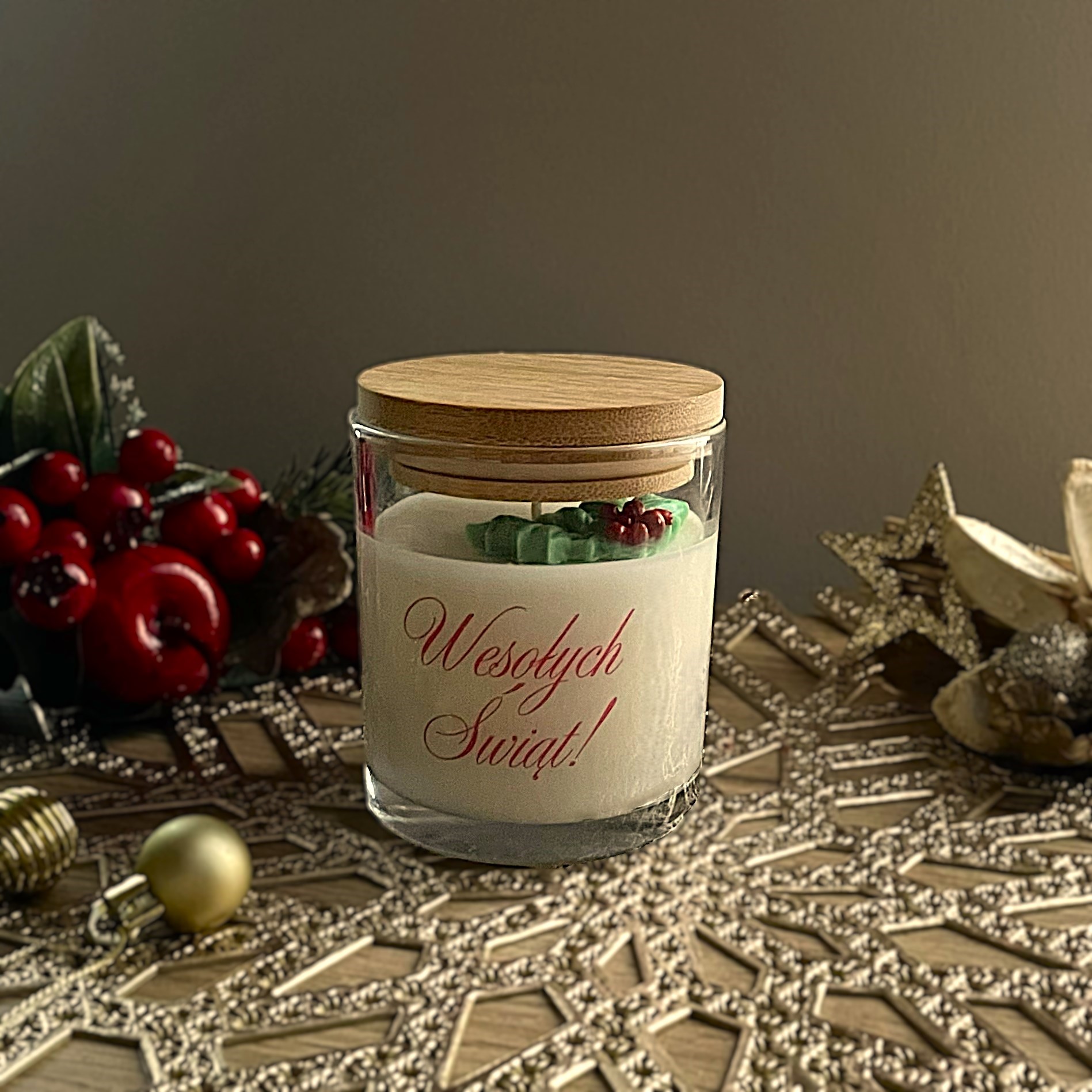 Świeca sojowa w szklanym słoiczku świąteczna „Wesołych Świąt”