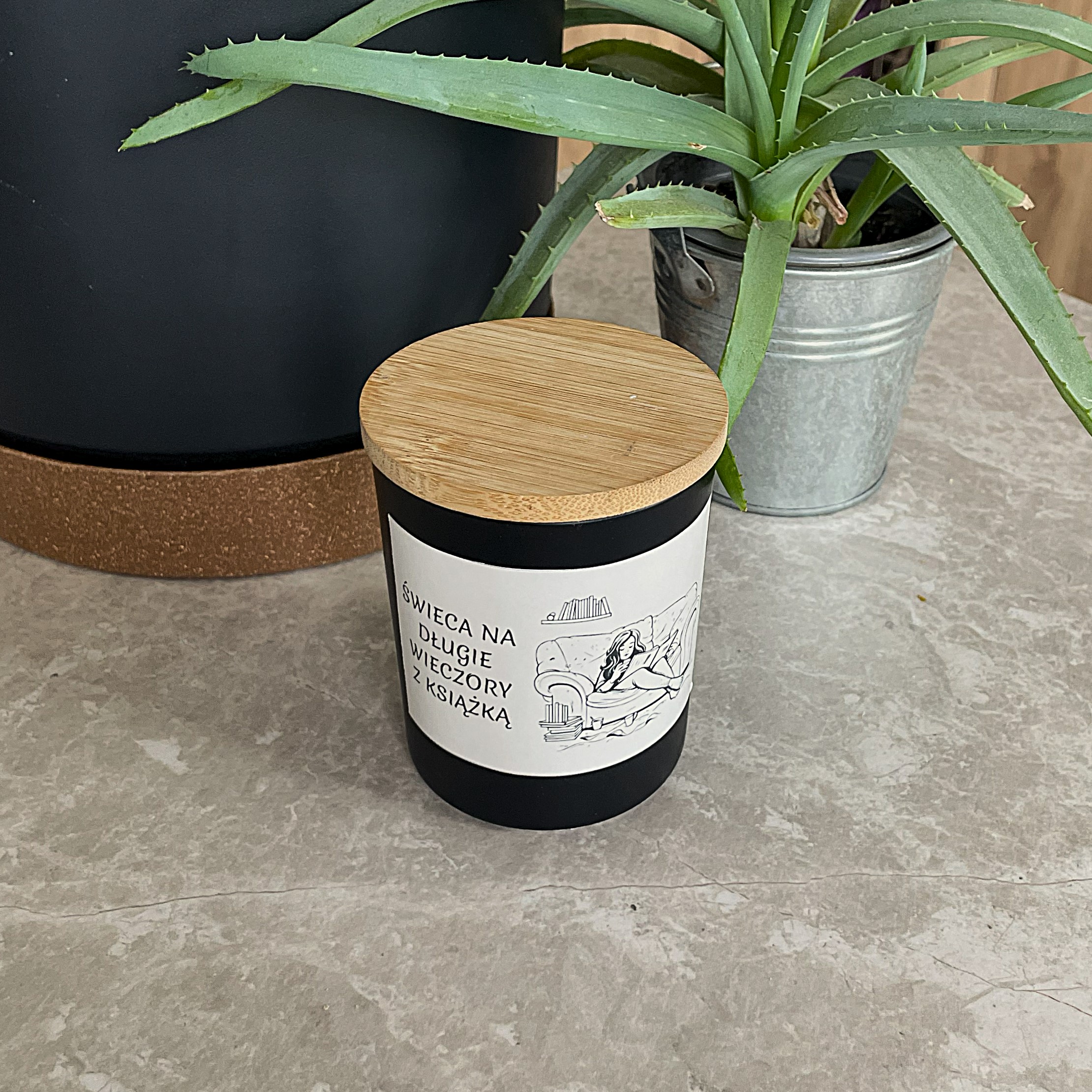 Świeca zawiera 150 g naturalnego wosku sojowego, który pali się czysto, równomiernie i znacznie dłużej niż tradycyjny parafinowy wosk. Jej minimalistyczna etykieta z napisem „Świeca na długie wieczory z książką” będzie pięknym akcentem na biurku, półce lub stoliku nocnym.