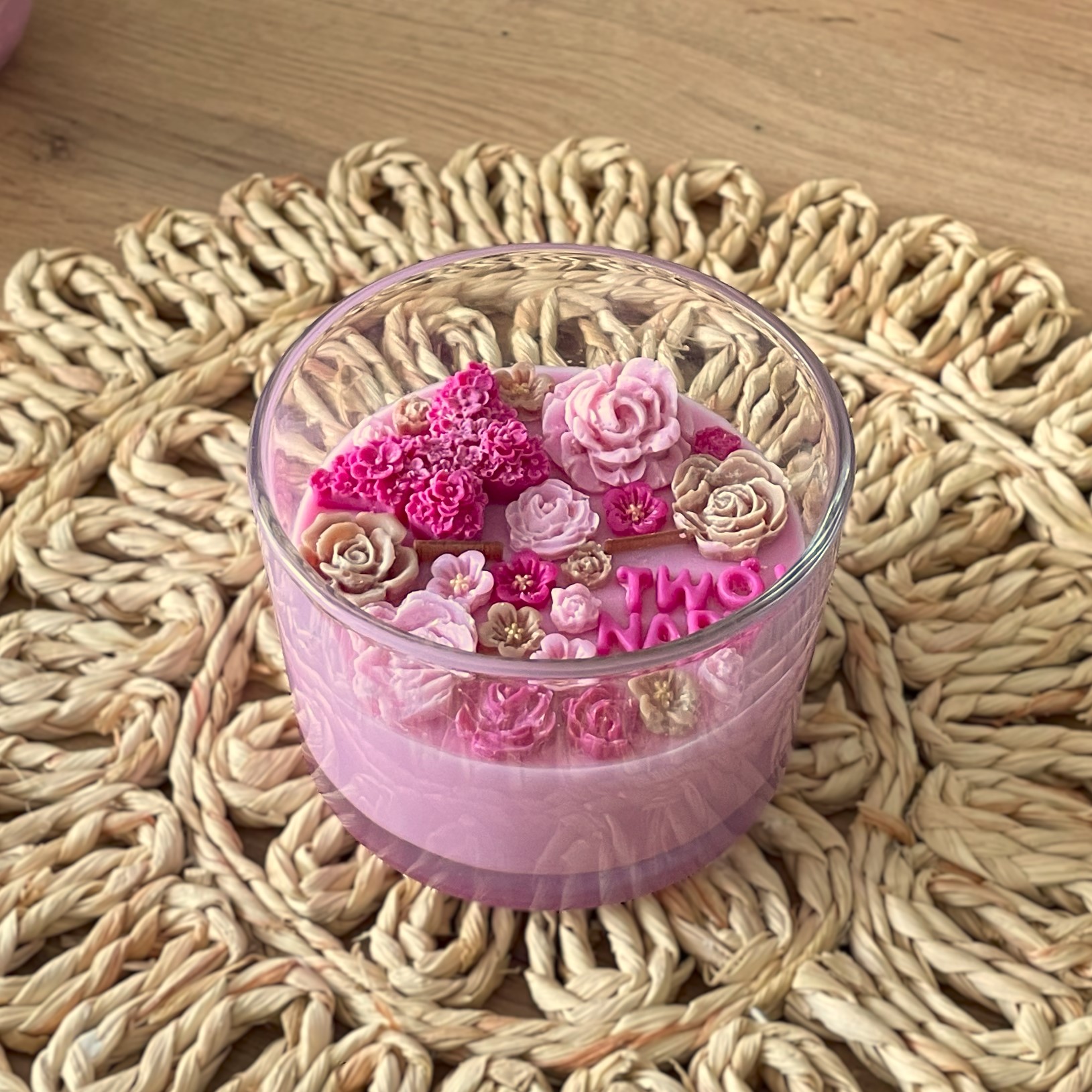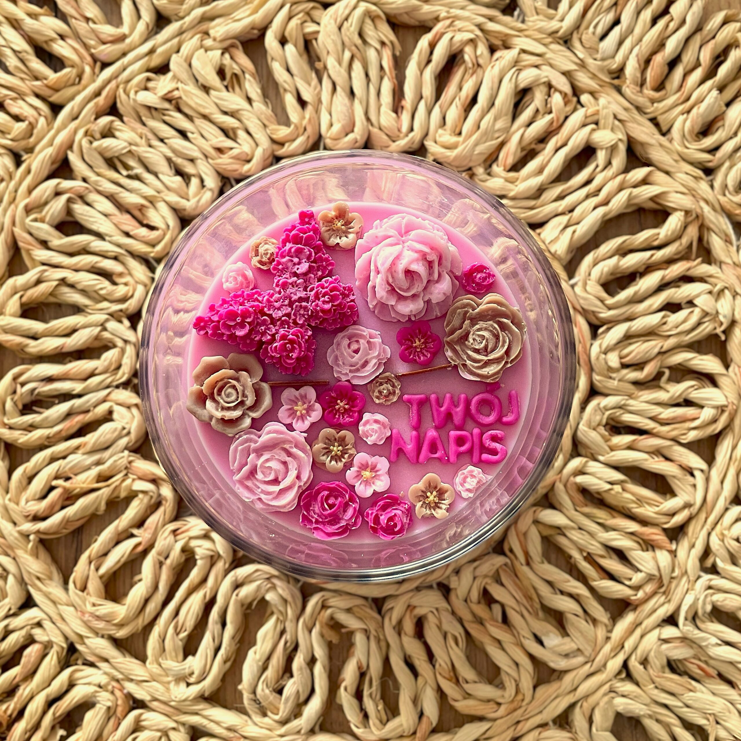 Różowa świeca sojowa z ozdobnymi kwiatami i delikatnym motylkiem to wyjątkowa dekoracja oraz prezent na wiele okazji. Jej subtelny wygląd sprawia, że doskonale sprawdzi się jako upominek na Dzień Mamy, urodziny, imieniny, rocznicę, walentynki i wiele innych okazji.