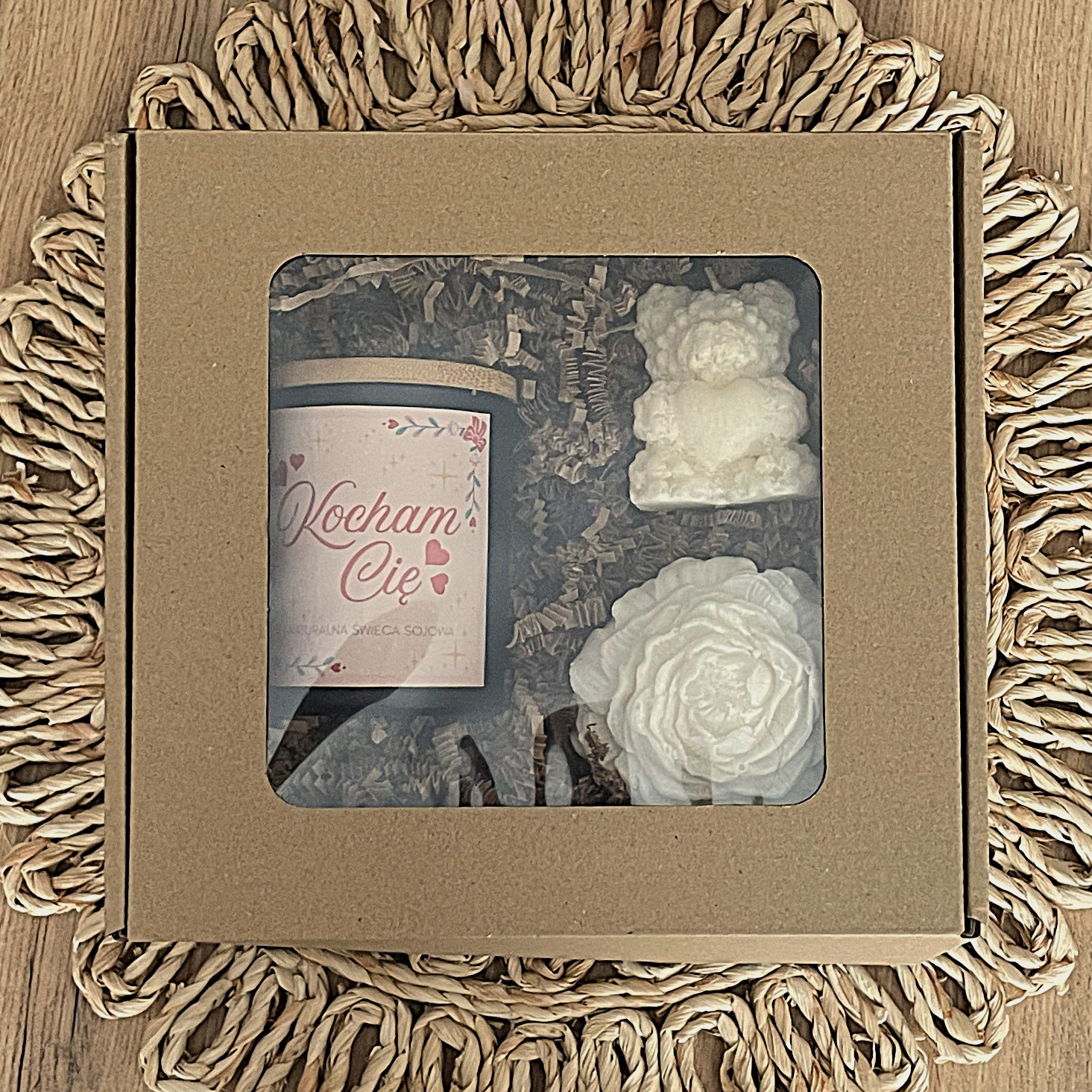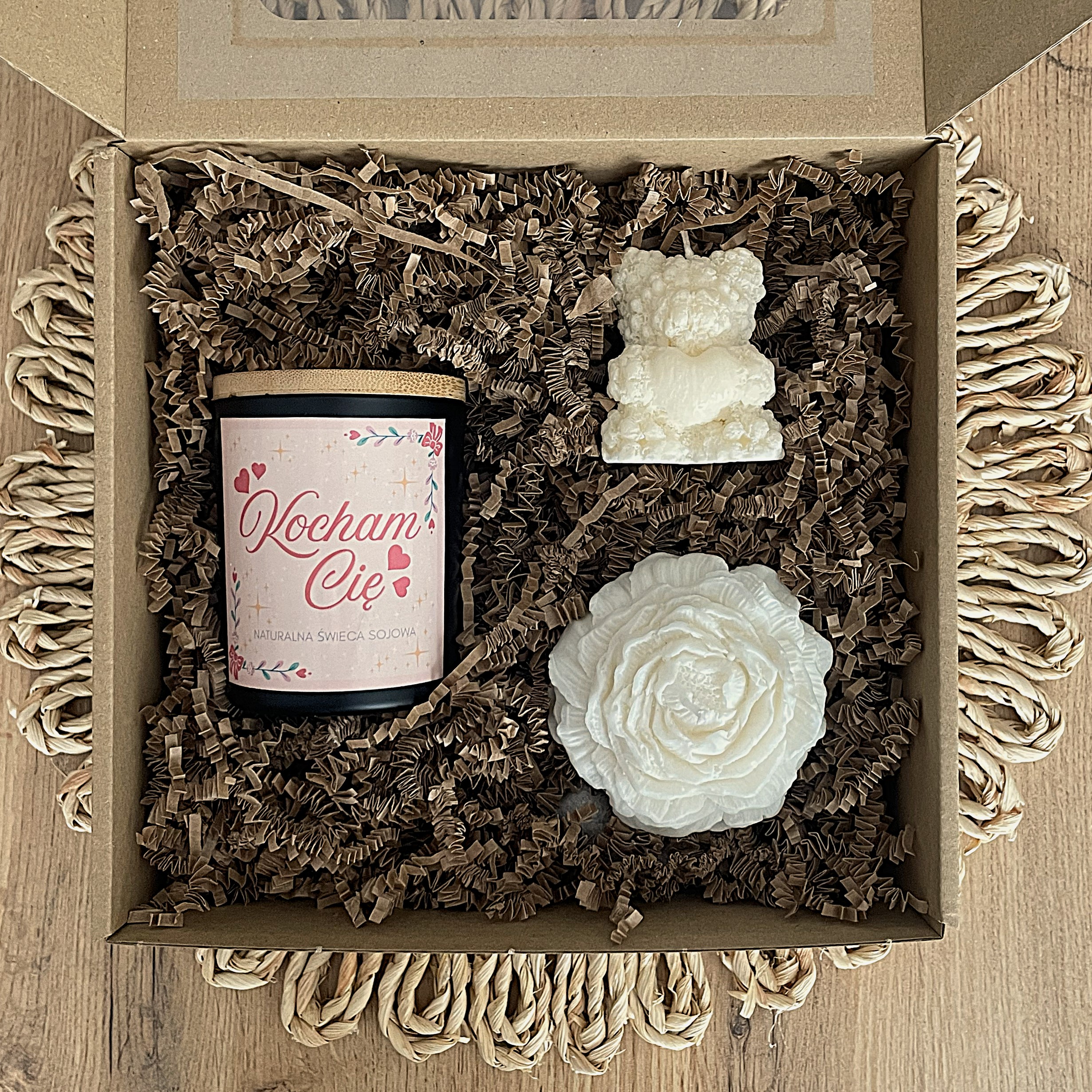 – Świeca sojowa w czarnym, matowym szkle z bambusową pokrywką, zawierająca 140 g naturalnego wosku sojowego. Świeca posiada subtelną etykietę z napisem „Kocham Cię”, która nadaje całości osobisty i emocjonalny charakter.