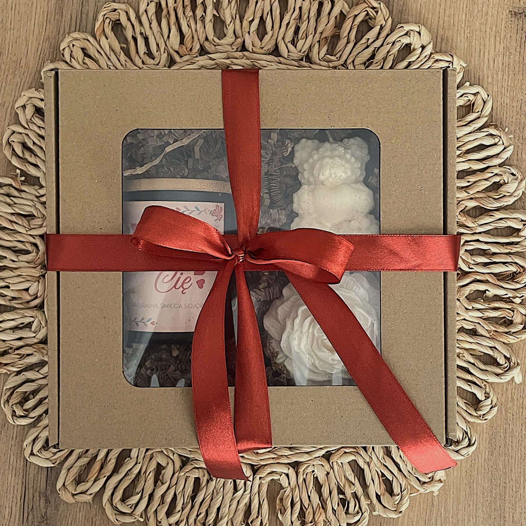 Całość zapakowana jest w eleganckie pudełko prezentowe z okienkiem, przewiązane czerwoną wstążką – to gotowy prezent, który zachwyca od pierwszego spojrzenia.