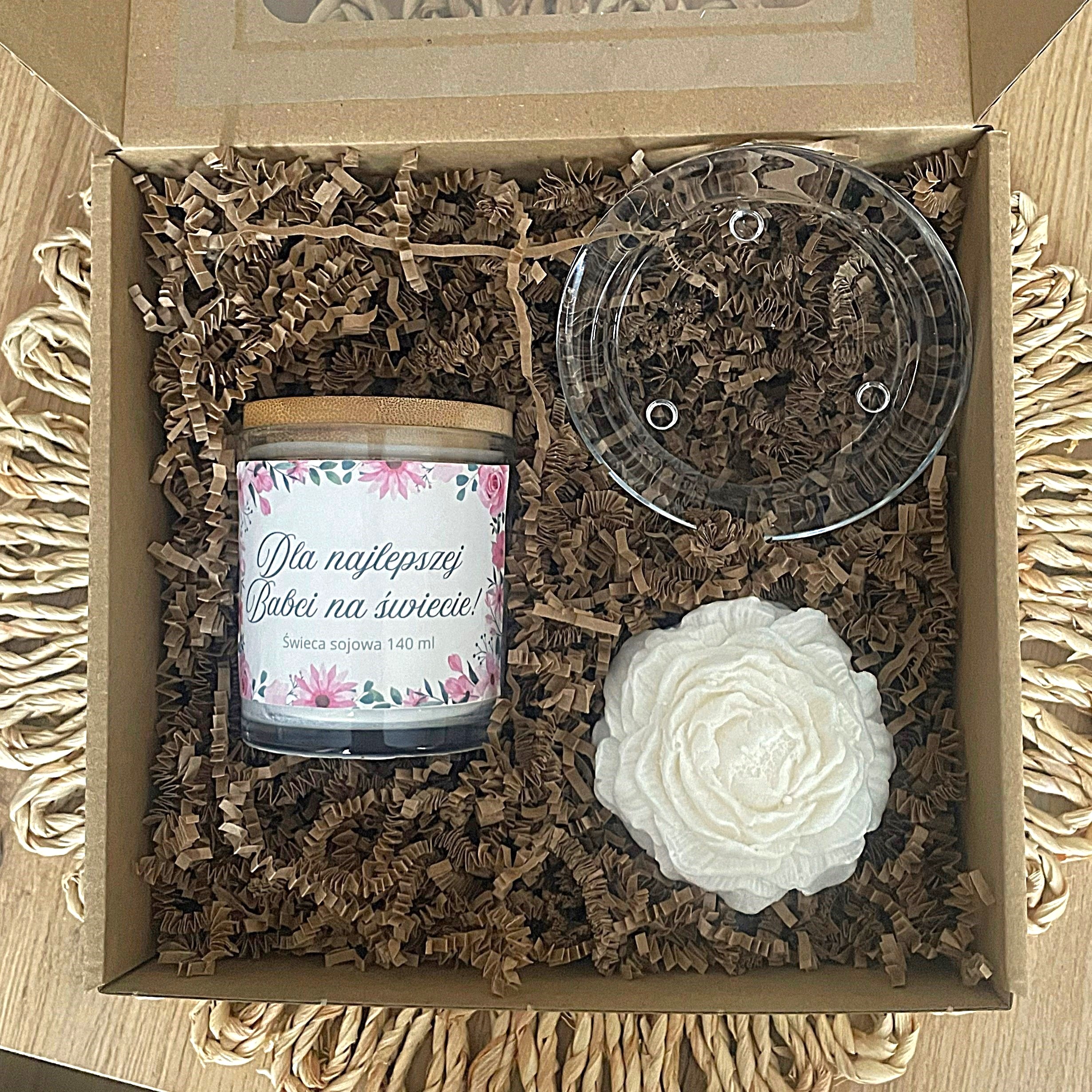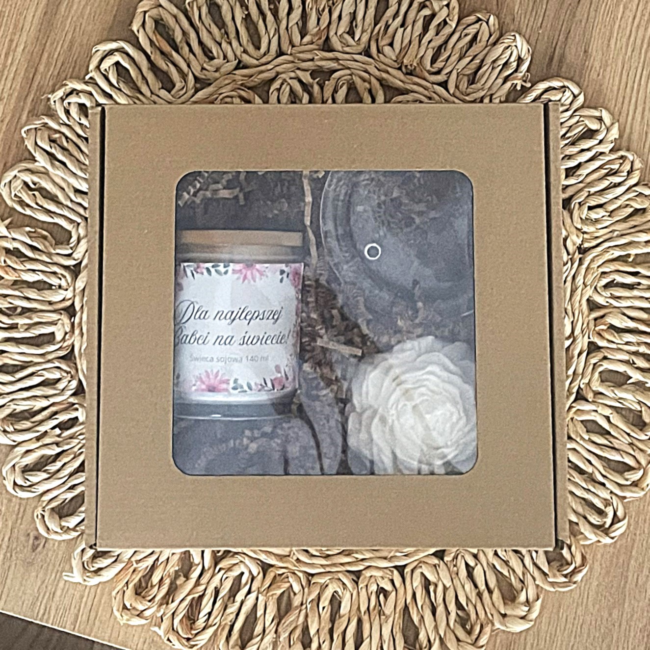– Świeca sojowa w szkle z bambusową pokrywką, zawierająca 140 g naturalnego wosku sojowego. Świeca posiada subtelną etykietę z napisem „Dla najlepszej Babci na świecie”, która nadaje całości osobisty charakter. Na jej powierzchni znajduje się dekoracyjny kształt róży, który nadaje całości wyjątkowego charakteru.