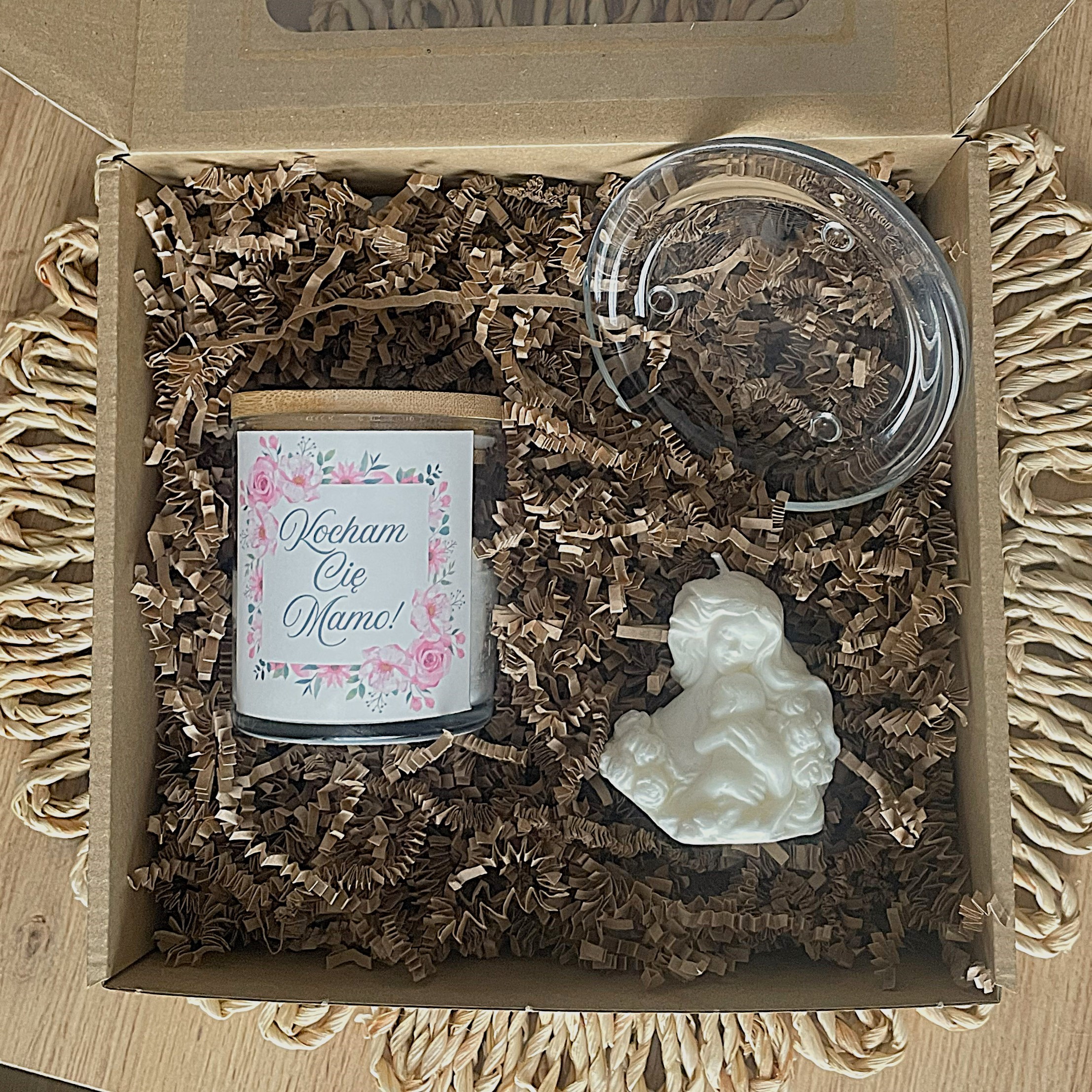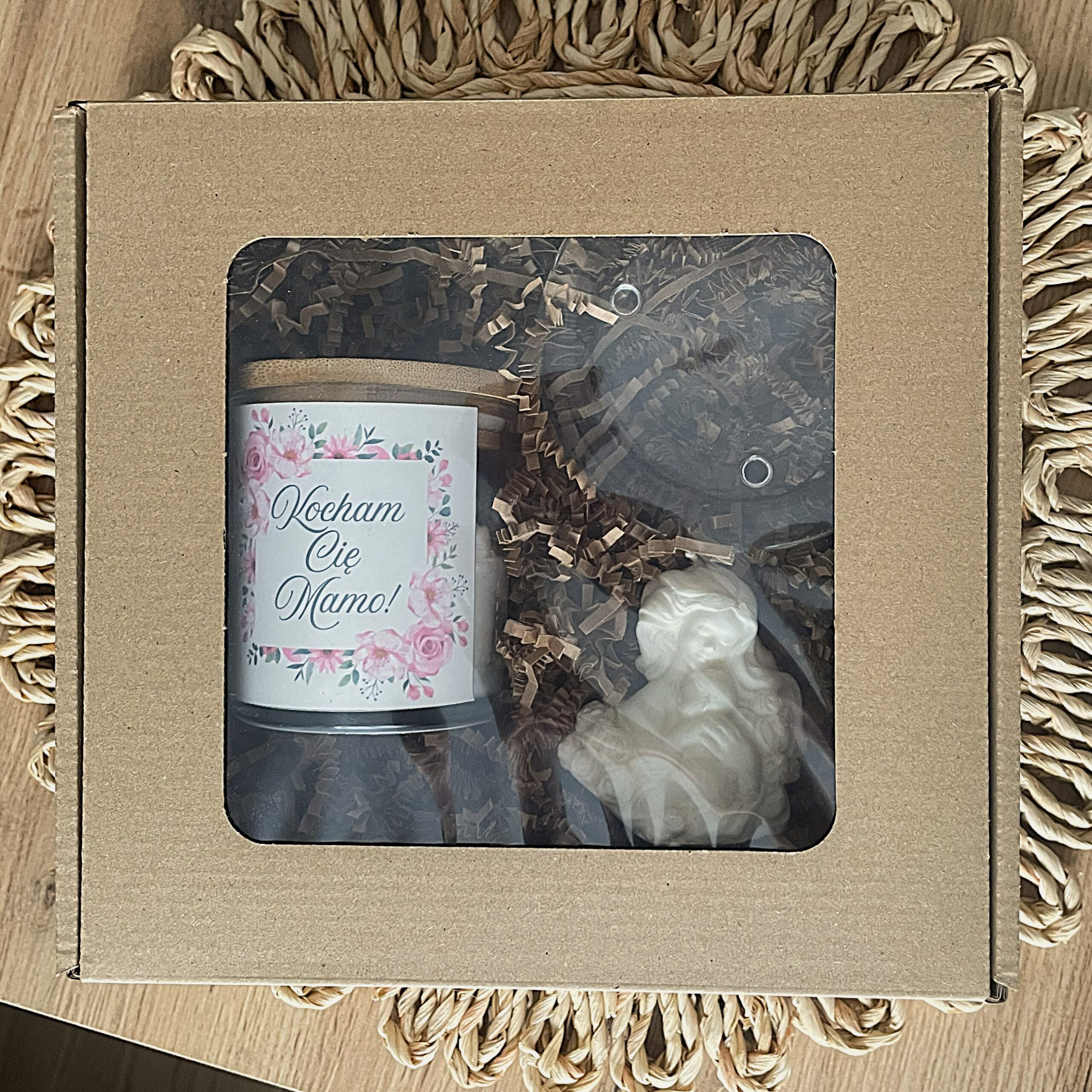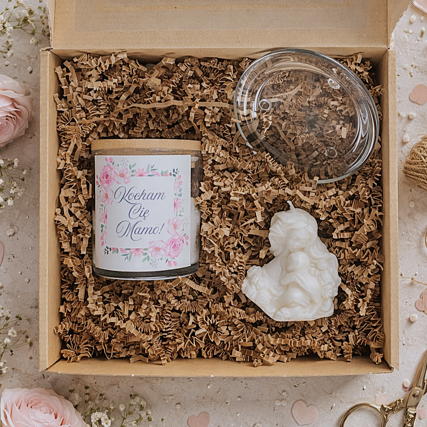 Ten zestaw prezentowy dla mamy łączy estetykę z symboliką. Ponadto świece tworzą przytulną atmosferę. W efekcie stają się wyjątkową pamiątką. Każdego dnia przypominają o miłości dziecka.