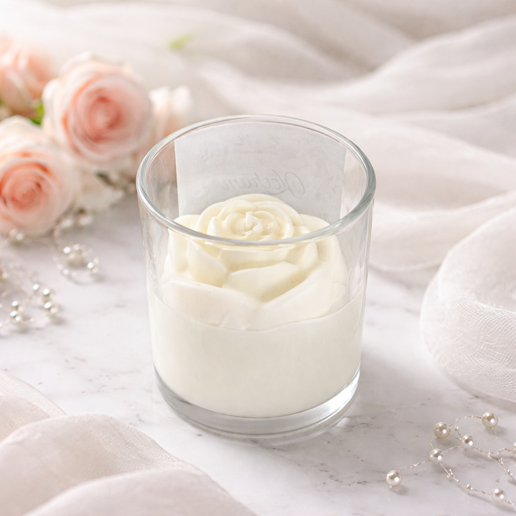 świecę sojową w przezroczystym szklanym słoiczku z bambusową pokrywką oraz etykietą „Kocham Cię Mamo”; powierzchnię świecy zdobi delikatny kształt róży,