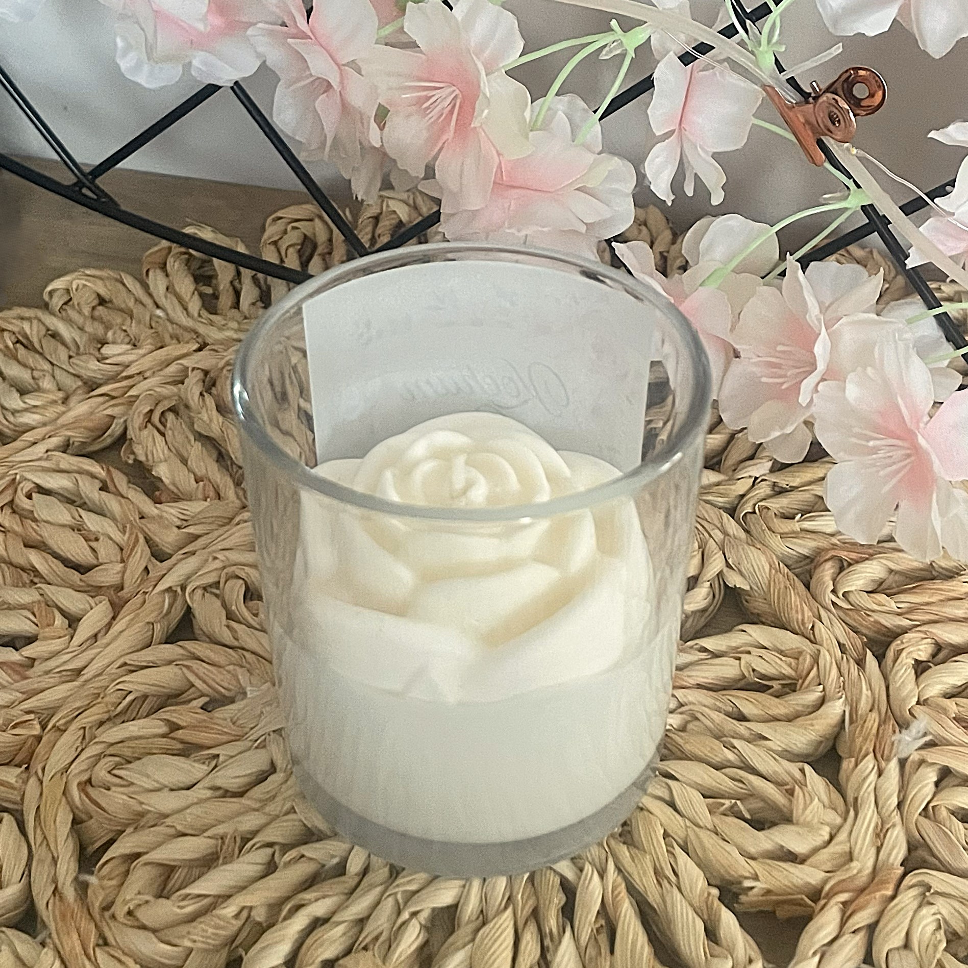 • świecę sojową w przezroczystym szklanym słoiczku z bambusową pokrywką oraz etykietą „Kocham Cię Mamo”; powierzchnię świecy zdobi delikatny kształt róży,